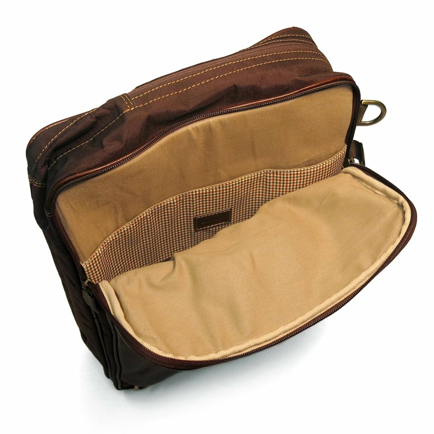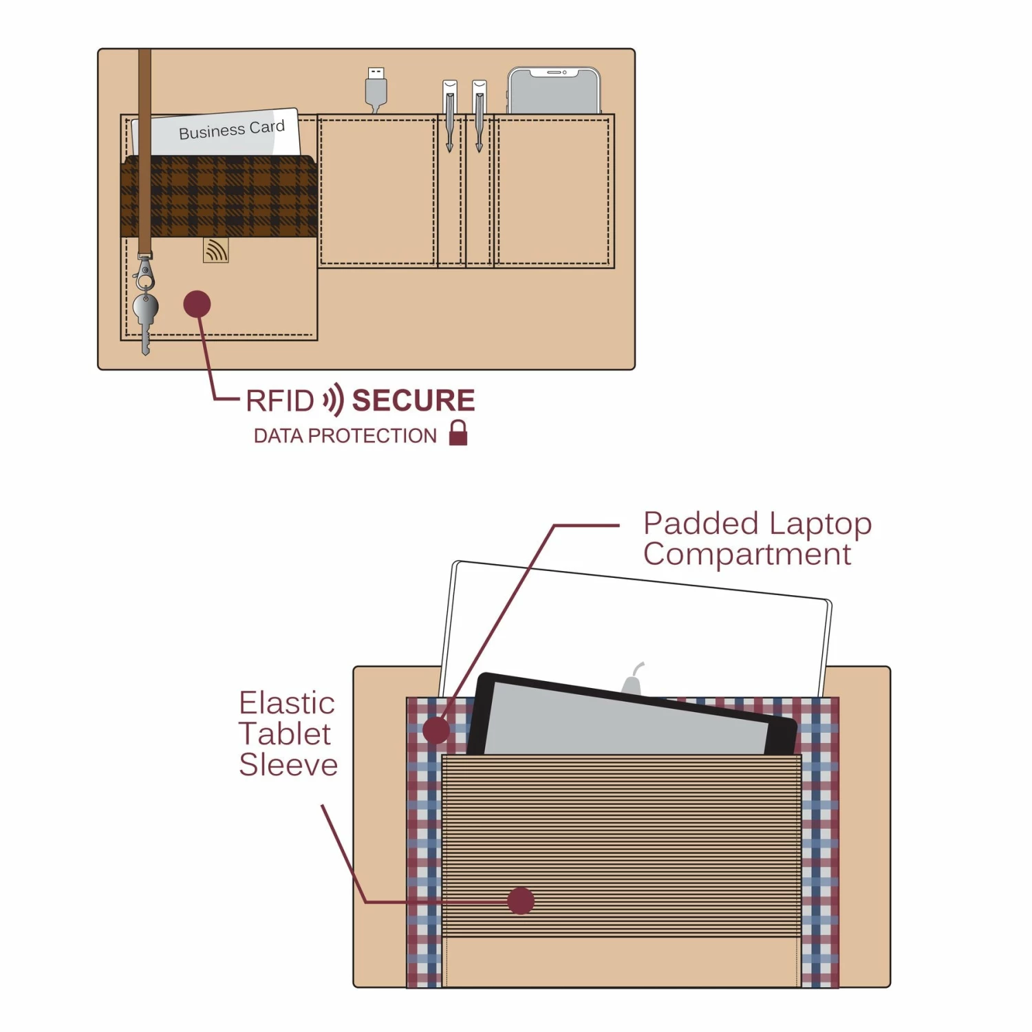 - Interior organizer panel with RFID protected pocket, business card pocket, charger pocket, two pen slots, phone pocket, and clip for keys