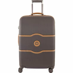 The Delsey Chatelet Hard 24″ Spinner Trolley offers leather-like accents as well as a deluxe interior. It is made from virgin polycarbonate formulated to achieve the highest standards of extreme temperature and impact resistance. Ever been on a moving bus or train and had your suitcase simply roll away from you? This luggage is equipped with an award-winning brake system. Activated with a button, the brake locks the two front wheels of the luggage preventing the bag from drifting away while allowing travelers to roll the bag on the back two wheels.