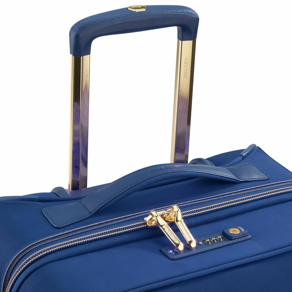 Elegant, functional and lightweight, the Montrouge collection will make fashion forward travelers feel and look fabulous on the go! The gold metal accents, vegan-leather trim and stylish interior print bring the perfect touches to this feminine collection. This spinner upright features a unique split book opening with two full size compartments for optimized organization, as well as removable and washable lining (delicate cycle) for added convenience. This women’s bag is also equipped with an integrated TSA-accepted lock, and DELSEY patented zip SECURITECH® technology that makes it 3 times stronger than a standard zipper. Silent-running, double spinner wheels offer superior maneuverability for travelers rushing through airports.
