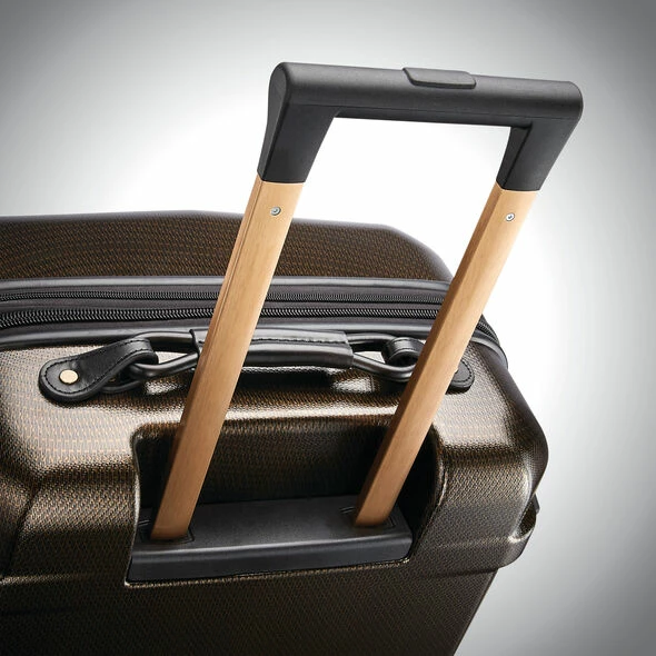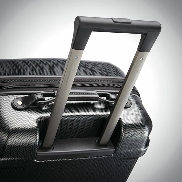 - Handles: Soft-touch, dual-stop pull handle with flush button for comfortable mobility, iconic leather-wrapped top carry handle