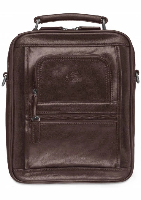 This unisex bag features a large zippered main compartment as well as multiple front zippered pockets. Includes a detachable shoulder strap.
