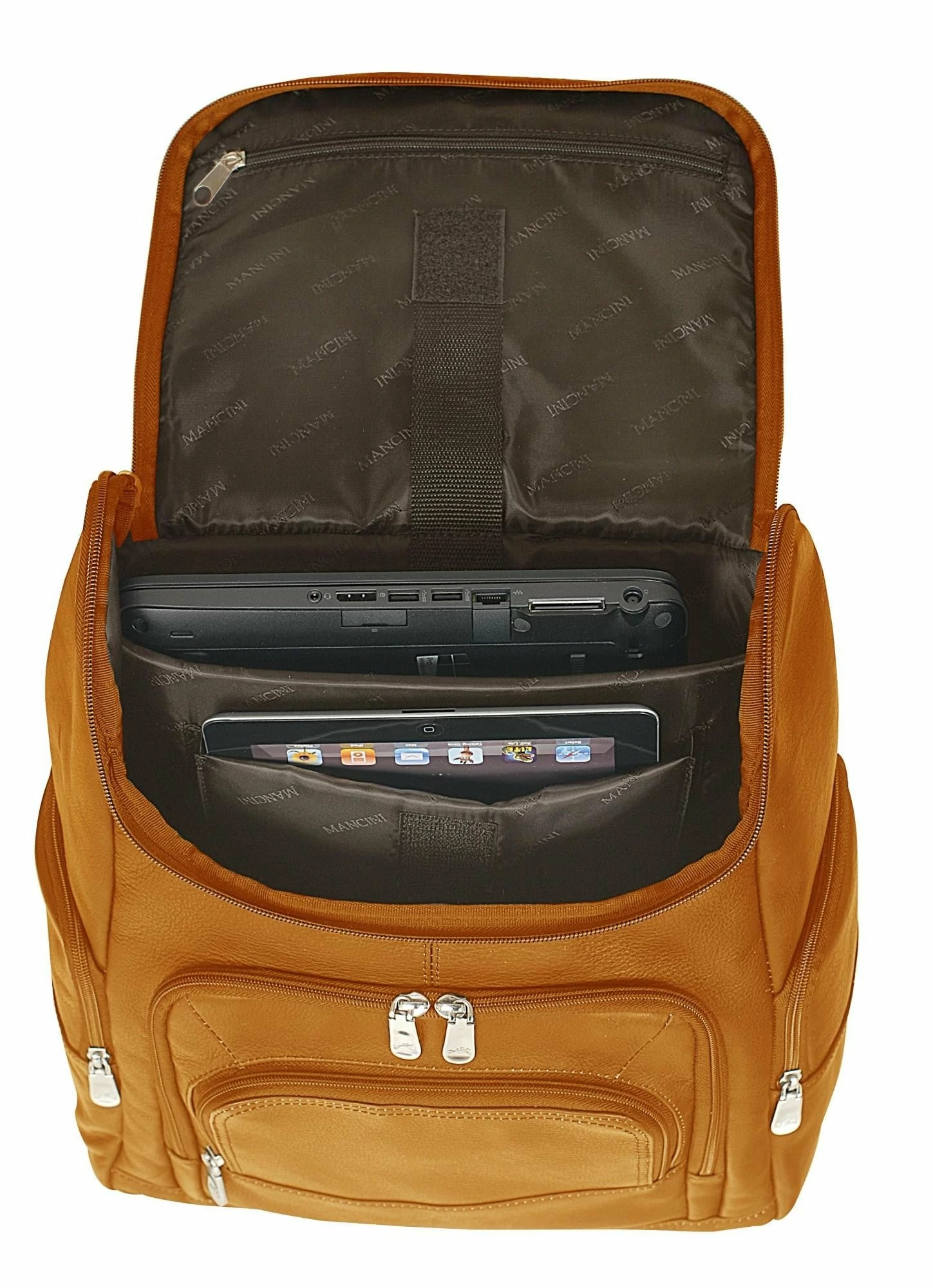 The Mancini Colombian RFID Backpack for Laptop and Tablet with Organizer features a zippered padded compartment to keep your laptop and tablet secure and protected, a zippered front organizer with multiple credit card slots and pockets as well as convenient zippered pockets on both sides. The organizer is equipped with the latest RFID wave blocking technology to ensure your data and cards are safe.