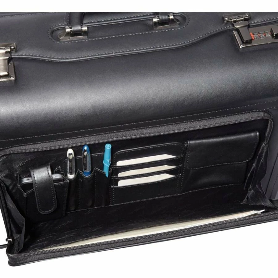 It’s all Business with our high-capacity wheeled laptop catalog case in black featuring a removable padded laptop sleeve to ensure that your laptop is safe and secure. This versatile genuine leather case is equipped with a zippered front organizer and separate compartments designed for transporting documents, folders, product samples, and lots more!