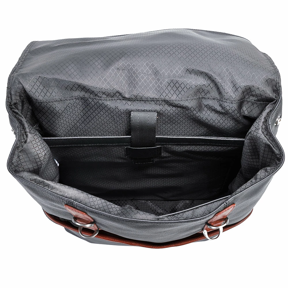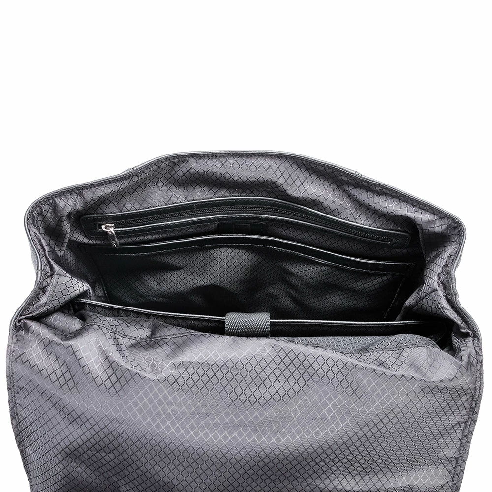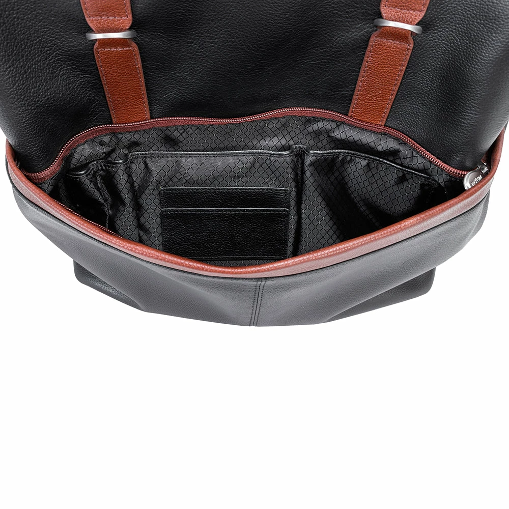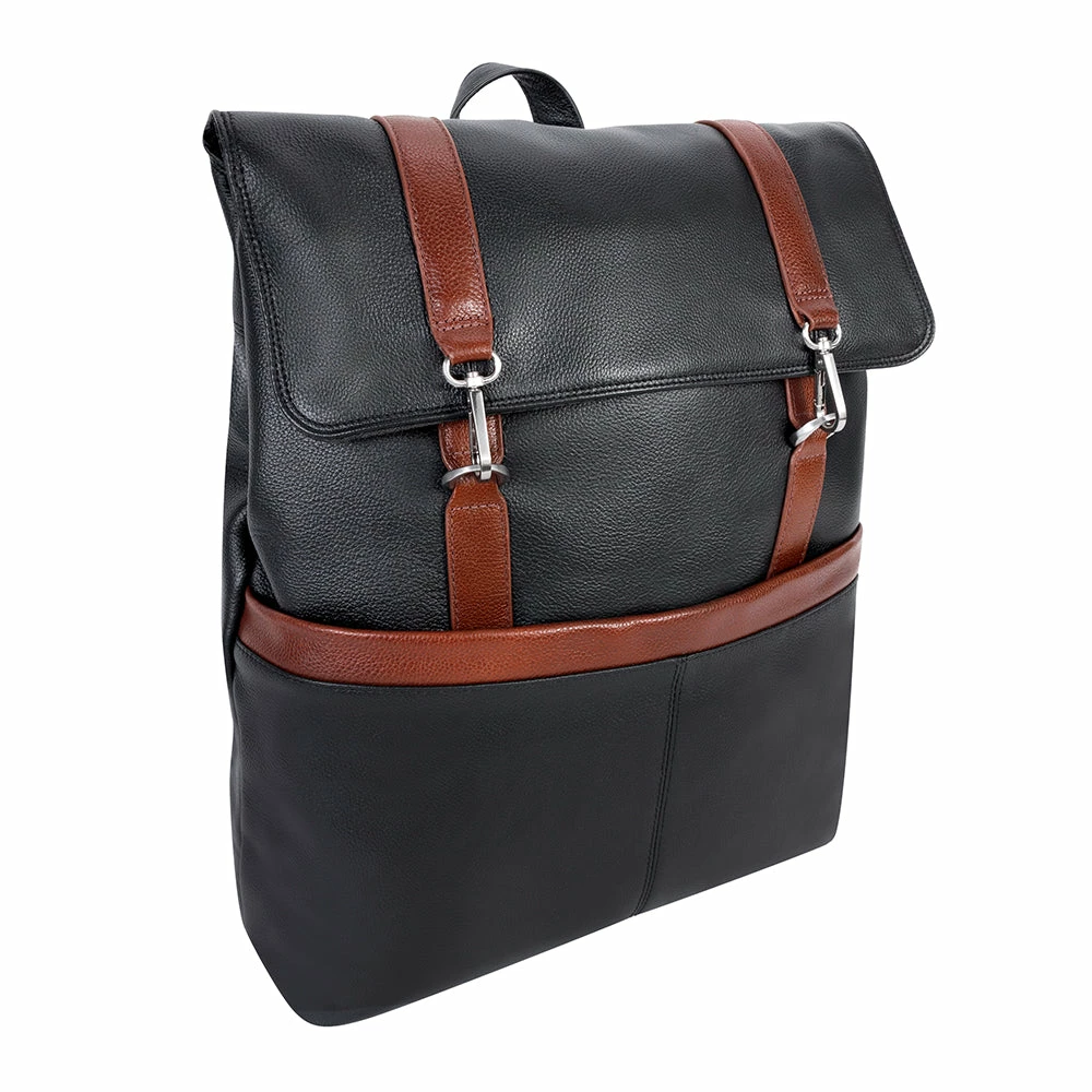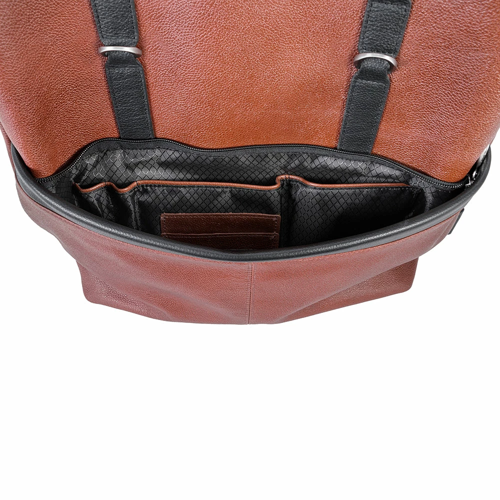 Our roomy 17” leather flap over backpack with elegant contrasting leather accents is perfect for carrying your Laptop and Tablet. Carry Comfortably with padded adjustable straps plus convenient leather handle. Access your most needed items easily from the front exterior full-length zipper pocket with business accessory organizer. If you’ve got a lot to carry, expand its compartment with the top two side buttons to provide more space for extra storage. The bag is fully lined with leather accents and silver hardware to make storage easy and pleasant. Keep important documents secure in the full-length interior zipper pocket. 17” padded built in laptop sleeve and padded tablet pocket stores and keeps your important devices safe. Rear exterior features ultra-padded with air flow system (AFS) and padded air mesh backpack straps. And set it down on 4 protective feet.