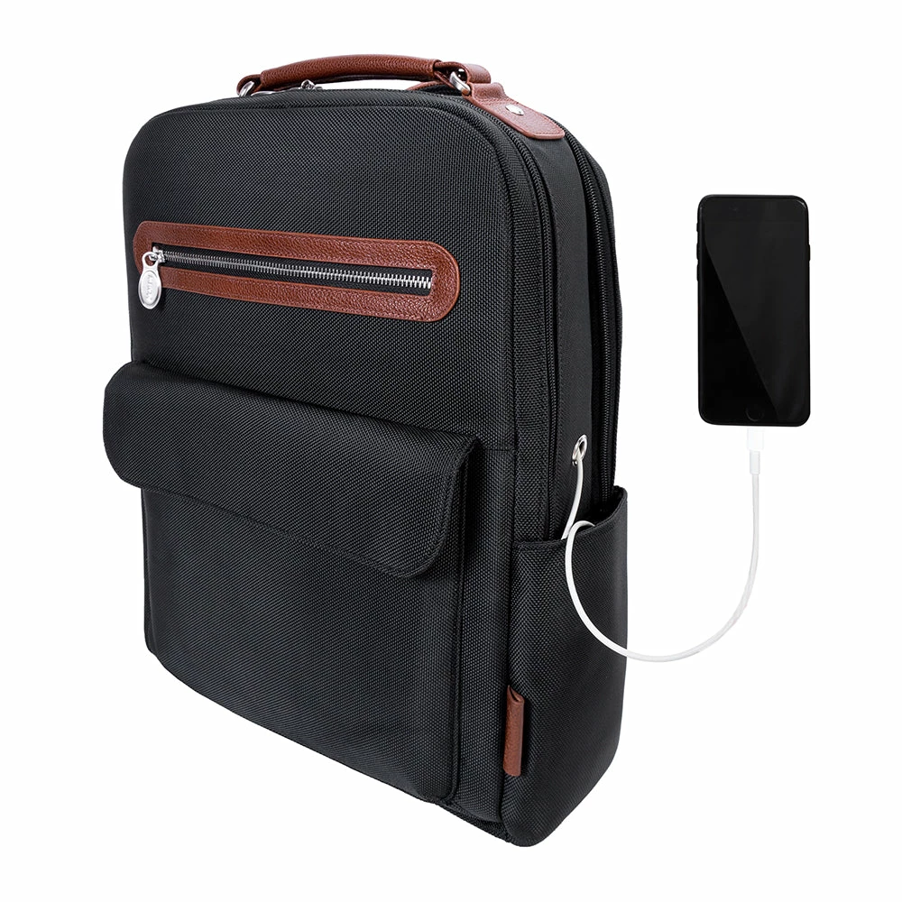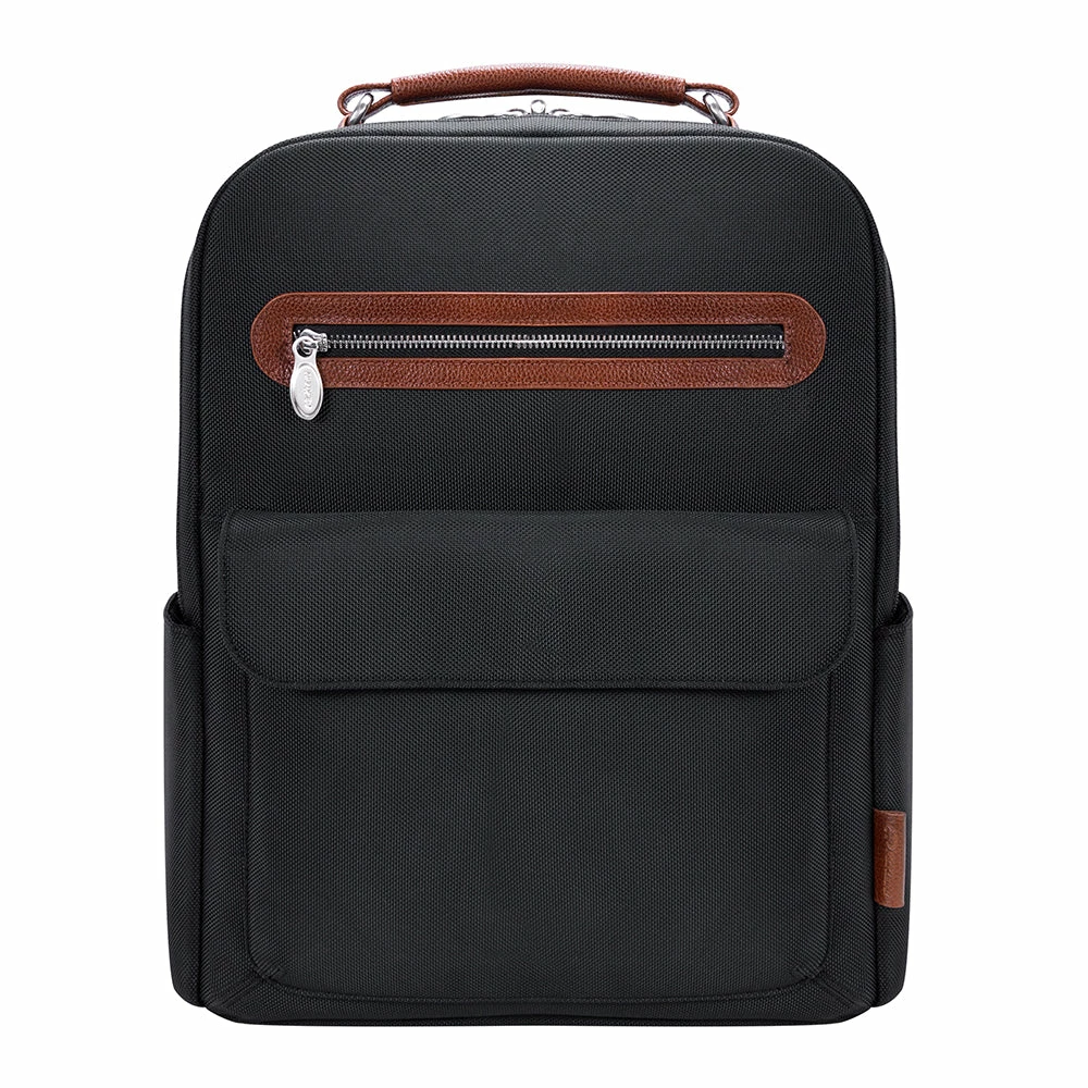 This 17” Nylon Backpack with elegant contrasting leather accents backpack is perfect for storing your laptop and tablet safely. Your personal cellphone and keys can be stored in the front zipper pocket for easy access. Store additional items in the front flip pocket with accessory organizer. Beat the heat and the downpour by storing your water and umbrella in the side pockets. Fully lined interior with a padded laptop compartment and tablet pocket. Internal side mesh pocket with exterior access cord slot for carrying cell phone charger. Secured main compartment with anti theft lockable metal zipper. Keep your back dry with the padded air mesh back exterior. Turn the back pocket into a piggy back strap to attach to your rolling case. The leather straps are mesh padded for additional comfort and adjustability.