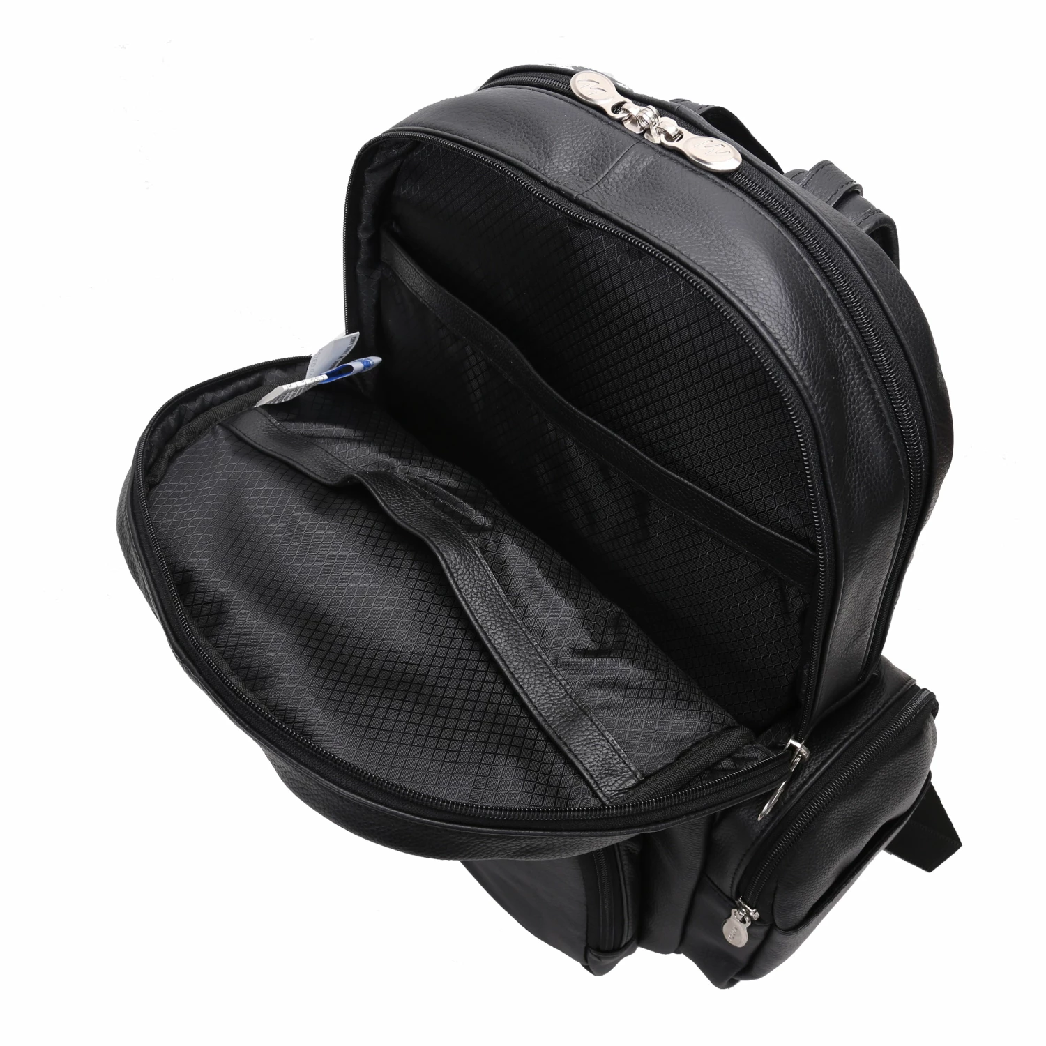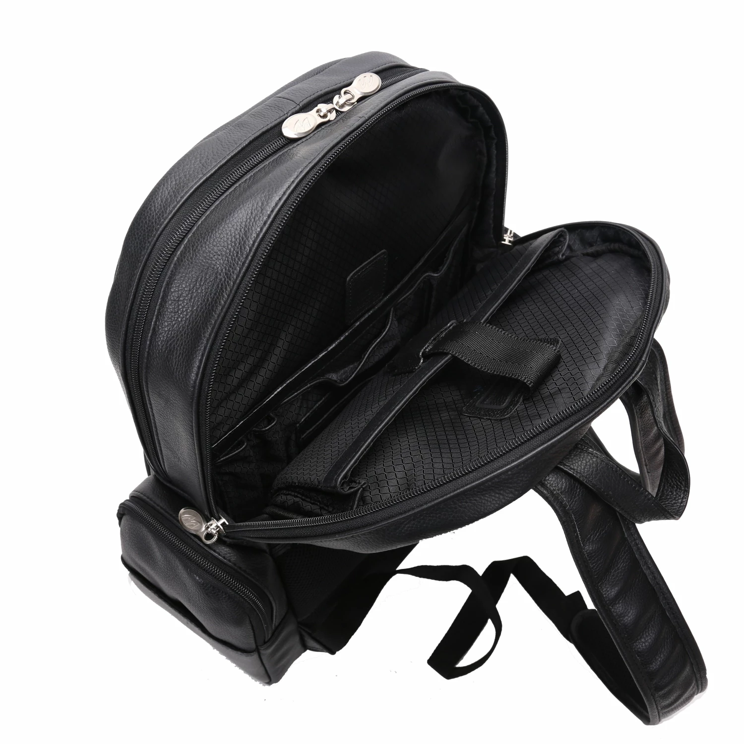 The McKlein USA Cumberland 15″ Leather Dual Compartment Laptop Backpack in Assorted Colors features an easy access front slip pocket with magnetic closure. Fully-lined interior with leather trim and silver accent hardware. Three exterior zip pockets with two side slit pockets. Front compartment with two slip pockets. Back compartment features padded laptop protection, tablet pocket with organizer for business cards, pens, and accessories. Padded Mesh Back with smart strap for piggy-backing onto rolling cases with padded adjustable backpack straps.