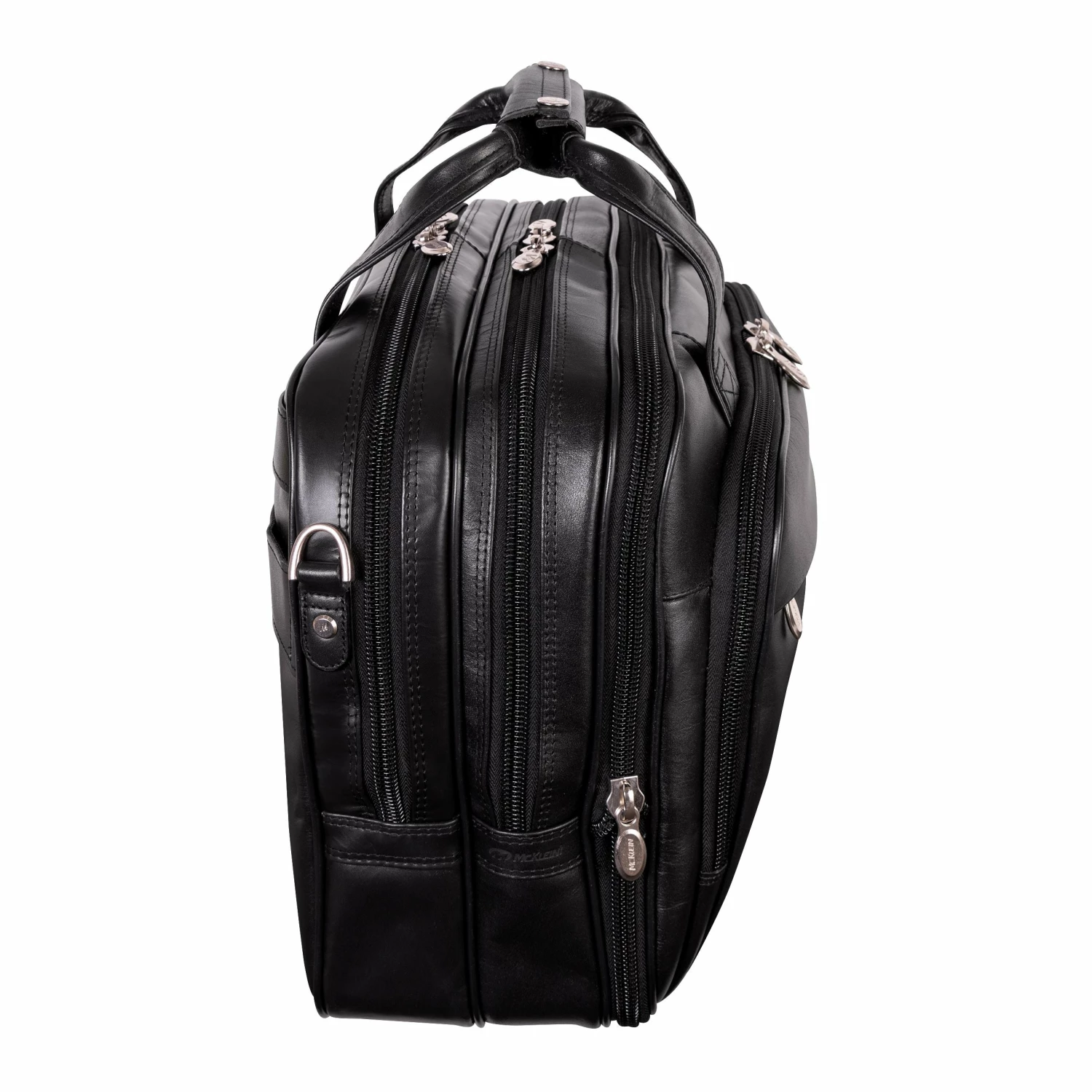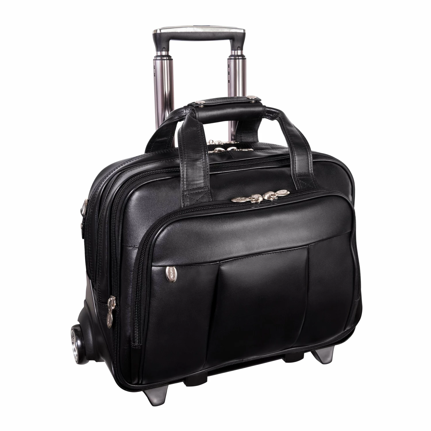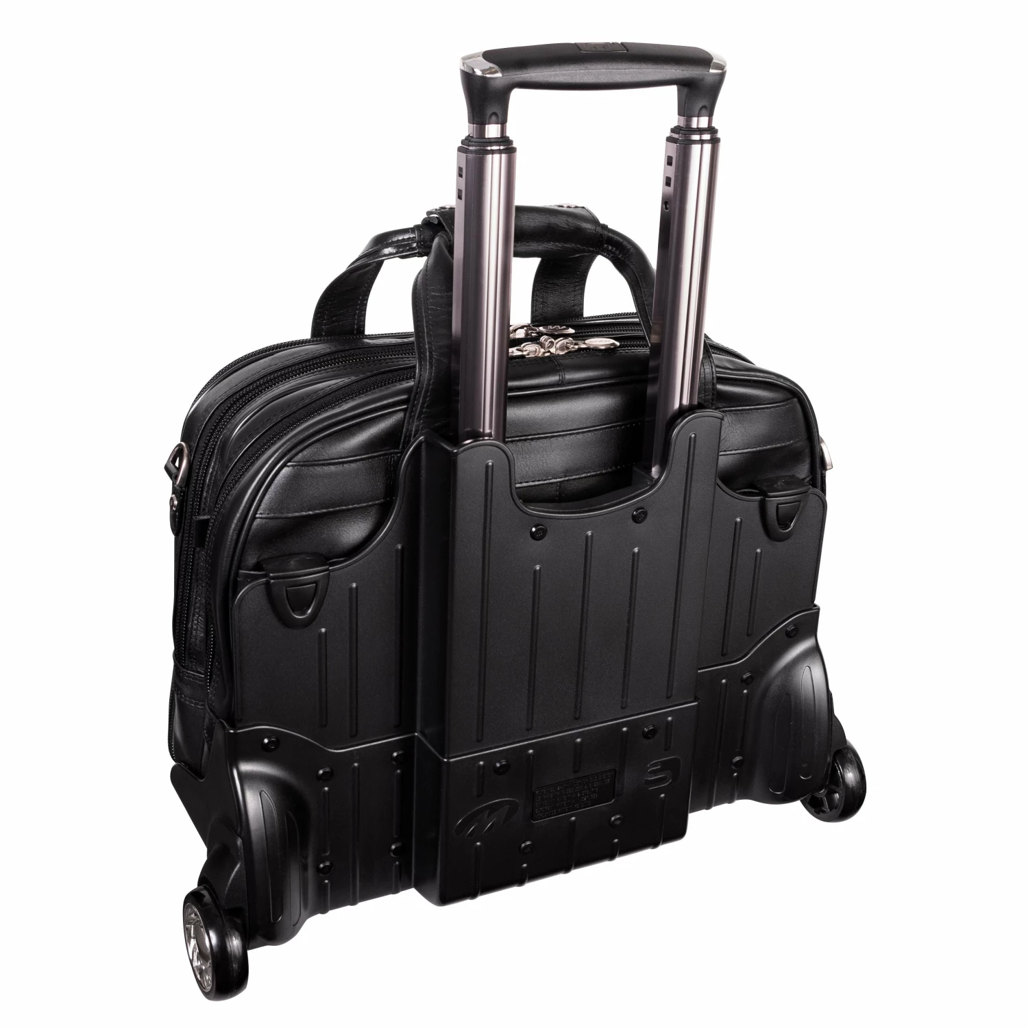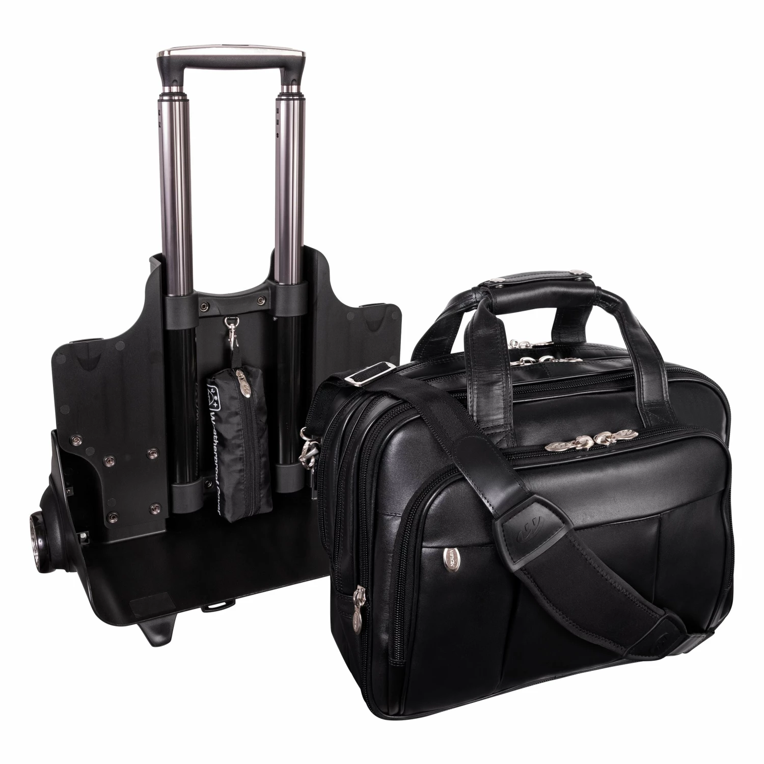 The McKlein USA Damen 17″ Leather Patented Detachable – Wheeled Laptop Briefcase features a front zipper pocket for small miscellaneous items. Front organizer pocket for media devices, cell phone, business cards, key holder and pens. Front compartment also features a 3-file divider that expands 2″ to allow 30% more space. Back compartment padded to protect laptops up to 17″ in size. Dual Laptop Protection System uses a high-tech ABS frame to protect laptop from exterior impact and a 10mm high-density foam to help absorb shock and prevent moisture intake. Smart Attachment Strap Attachment allows transport on extended handles of other rolling cases and luggage. Comfortable, non-slip, shock absorbing shoulder strap helps alleviate body strain.