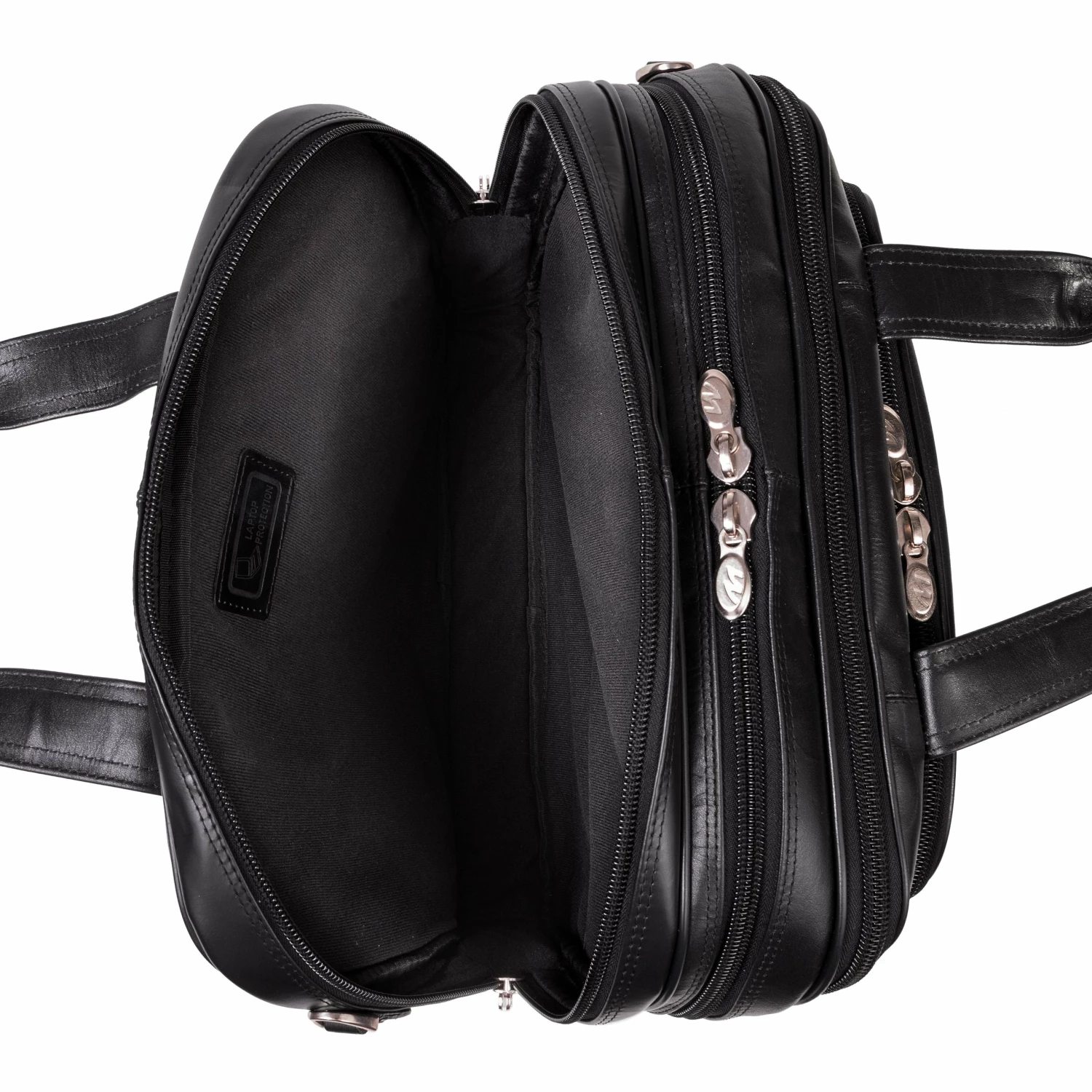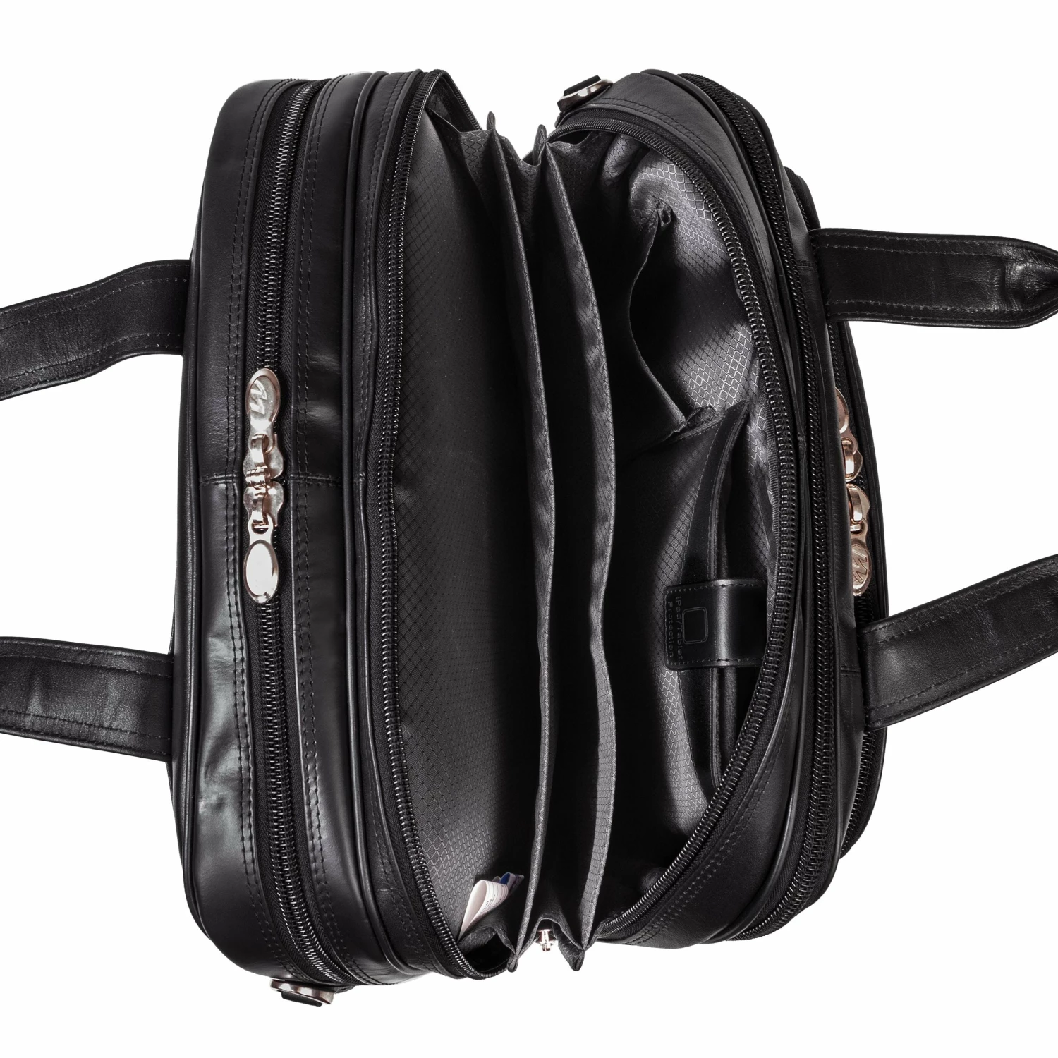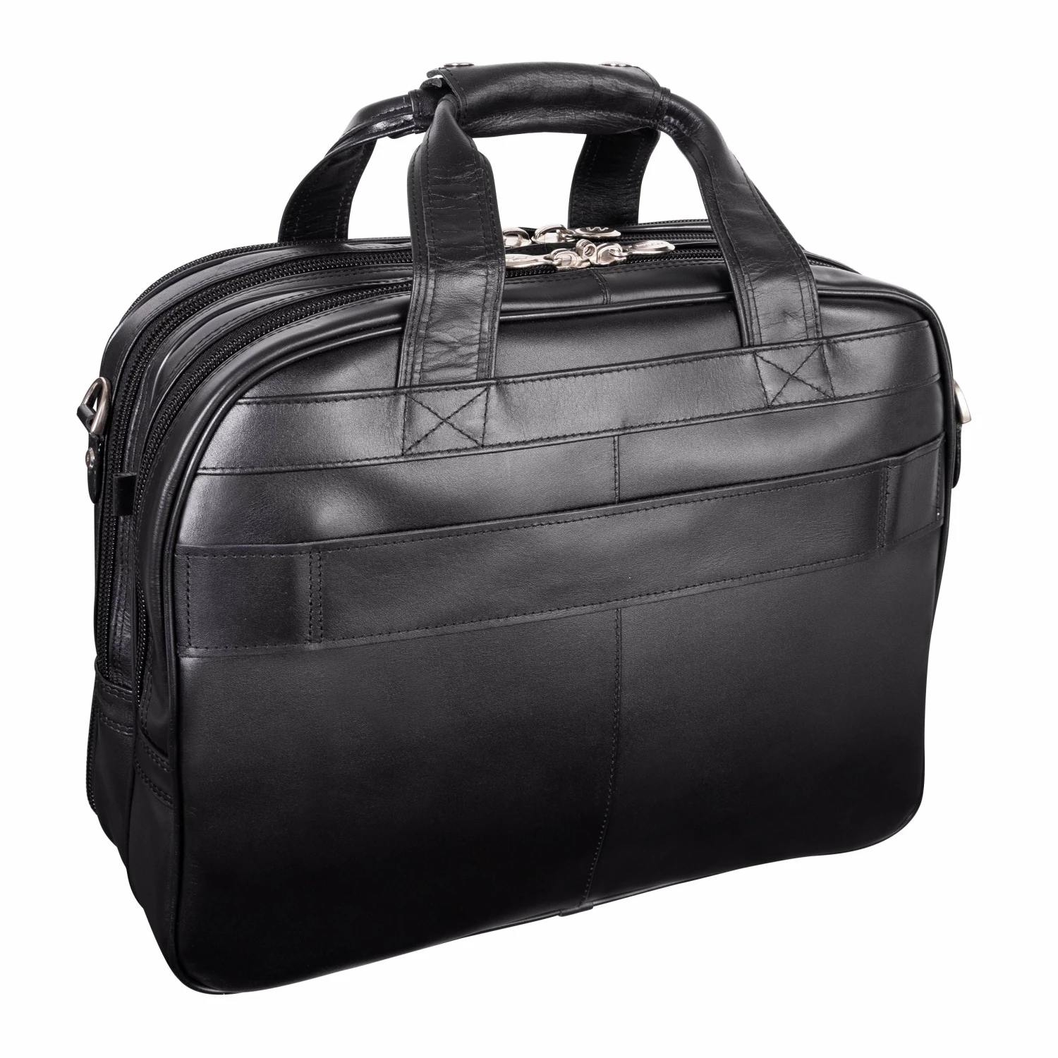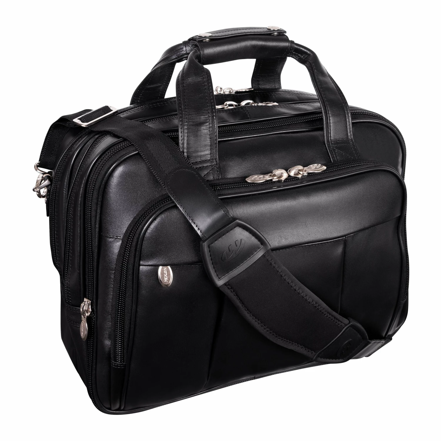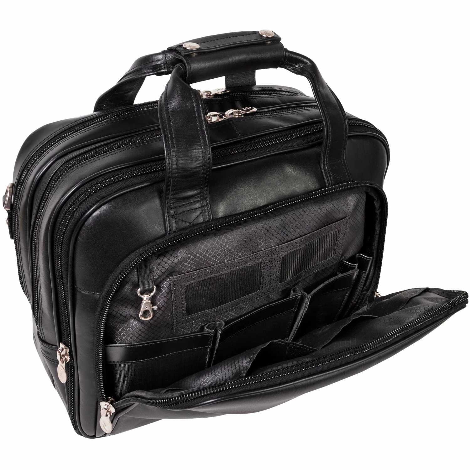 The McKlein USA Damen 17″ Leather Patented Detachable – Wheeled Laptop Briefcase features a front zipper pocket for small miscellaneous items. Front organizer pocket for media devices, cell phone, business cards, key holder and pens. Front compartment also features a 3-file divider that expands 2″ to allow 30% more space. Back compartment padded to protect laptops up to 17″ in size. Dual Laptop Protection System uses a high-tech ABS frame to protect laptop from exterior impact and a 10mm high-density foam to help absorb shock and prevent moisture intake. Smart Attachment Strap Attachment allows transport on extended handles of other rolling cases and luggage. Comfortable, non-slip, shock absorbing shoulder strap helps alleviate body strain.