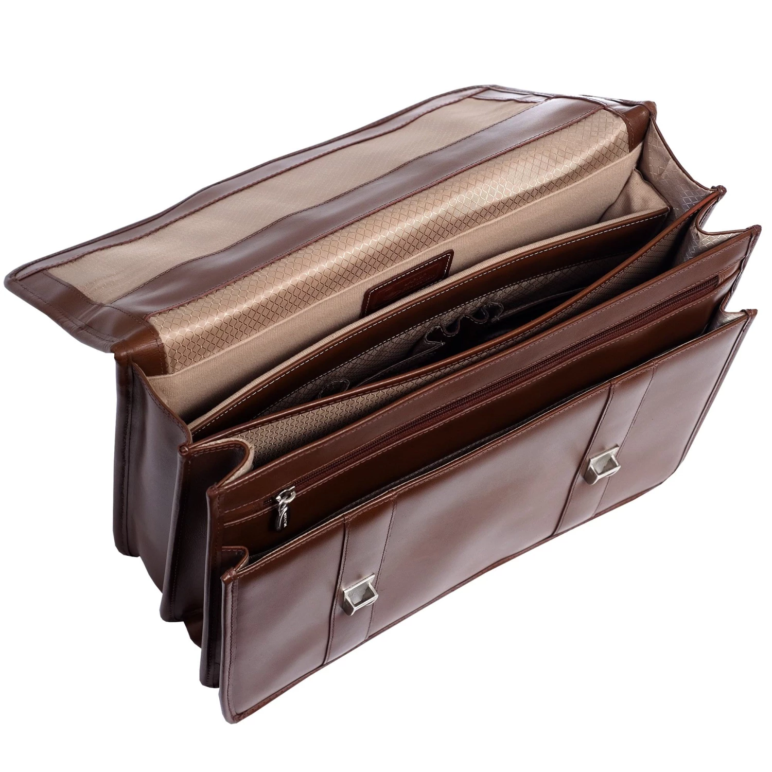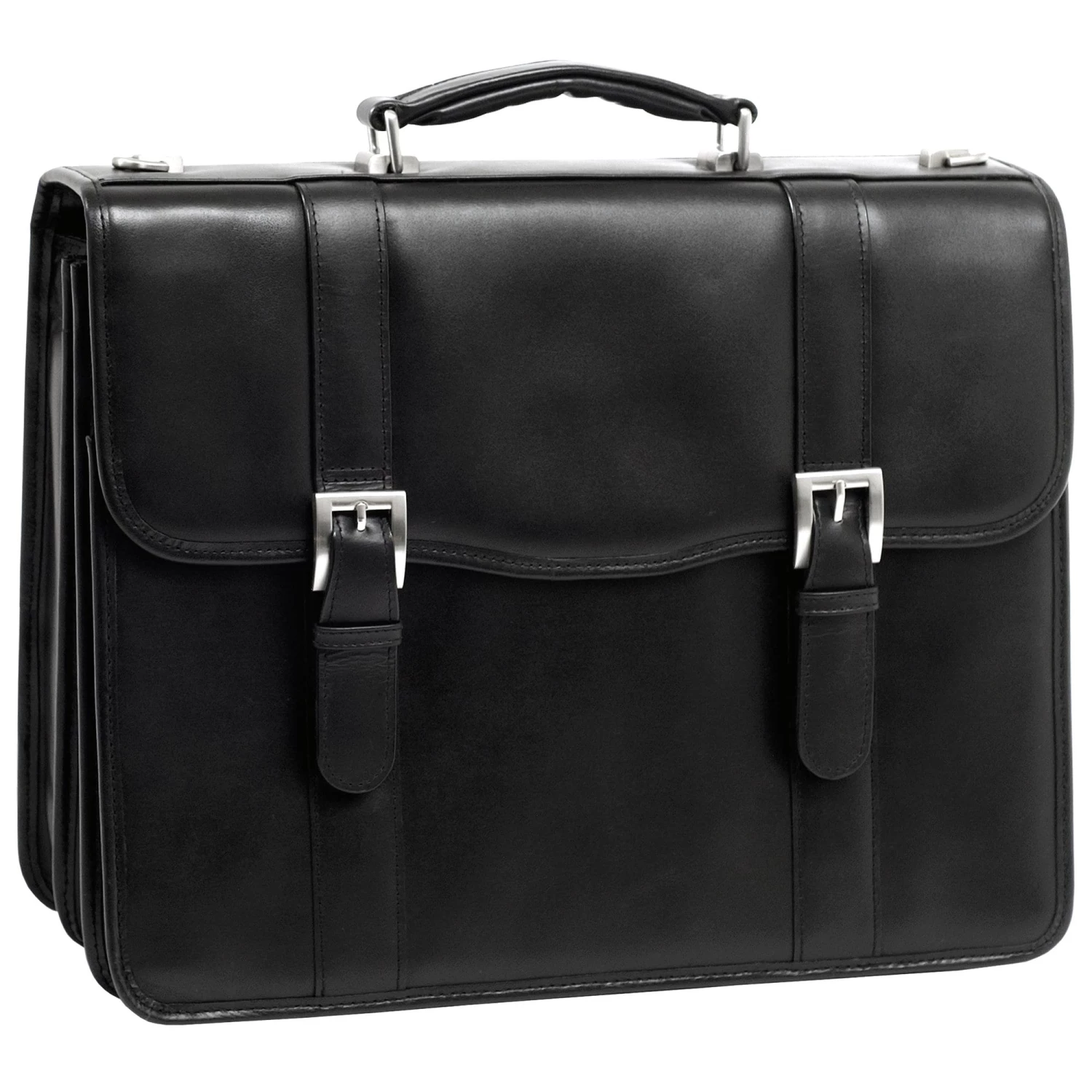 The McKlein USA Flournoy Leather Double Compartment Laptop Briefcase features a flap-over design with dual secure slip lock clasps. Dual front pockets hold small accessories, and front compartment provides space for files. Back compartment features an interior organizer for pens, business cards and small devices. Back compartment also features a padded laptop compartment that fits and protects most laptops up to 15.4″ in screen size. Adjustable, non-slip, shock absorbing shoulder strap alleviates body strain. Smart Zipper Attachment allows transport on extended handles of other rolling cases & luggage.