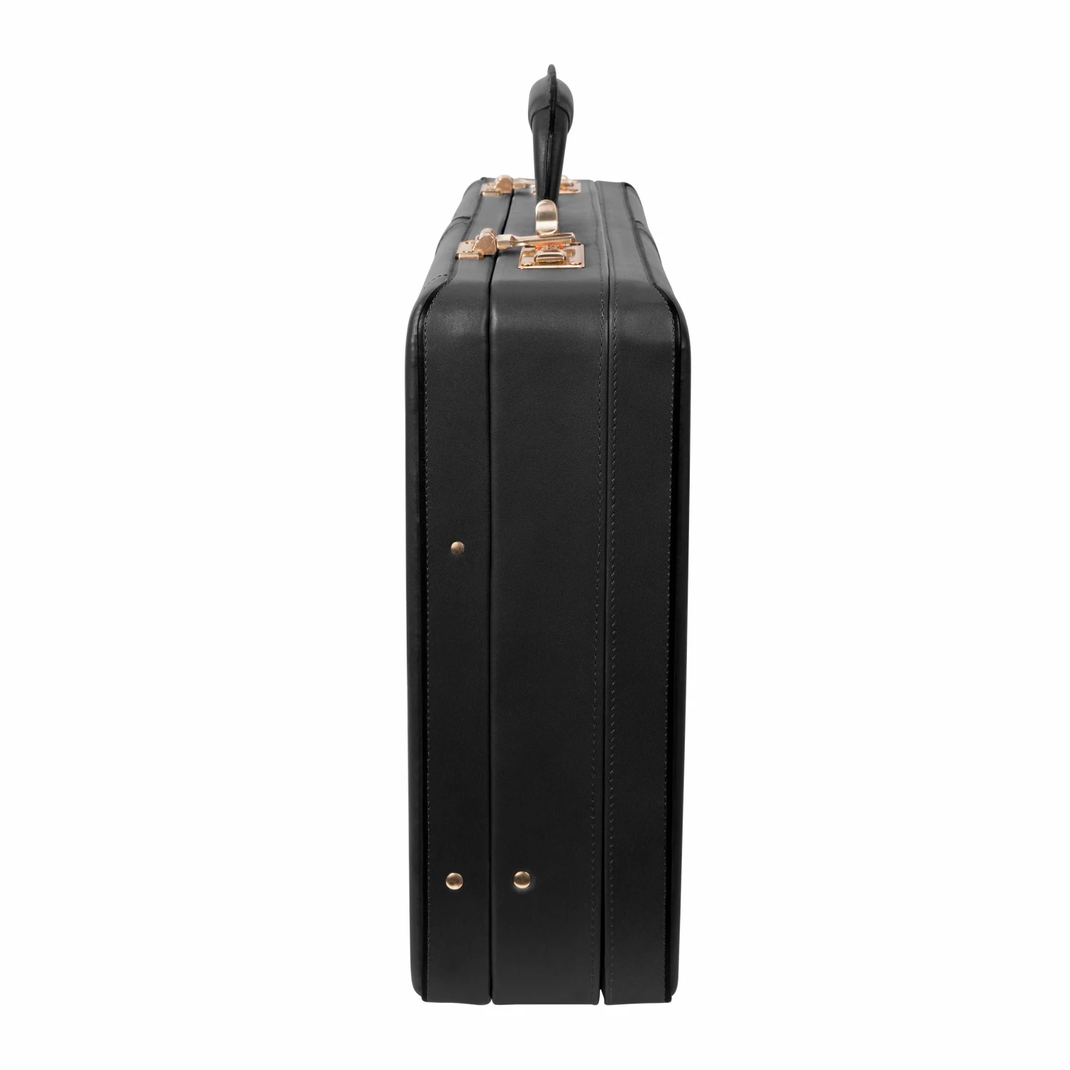 The McKlein USA Harper Leather Expandable Attaché Briefcase offers a slim design with 3-digit combination lock for added security. Gold-finished hardware and comfortable top carry handle. Protective feet keeps case from falling over. Easily accessible compartment opens and stays upright at 90 degrees. Main access compartment provides storage space for files. Compartment expands 1” providing added space when needed. Interior includes an organizer section that holds business cards