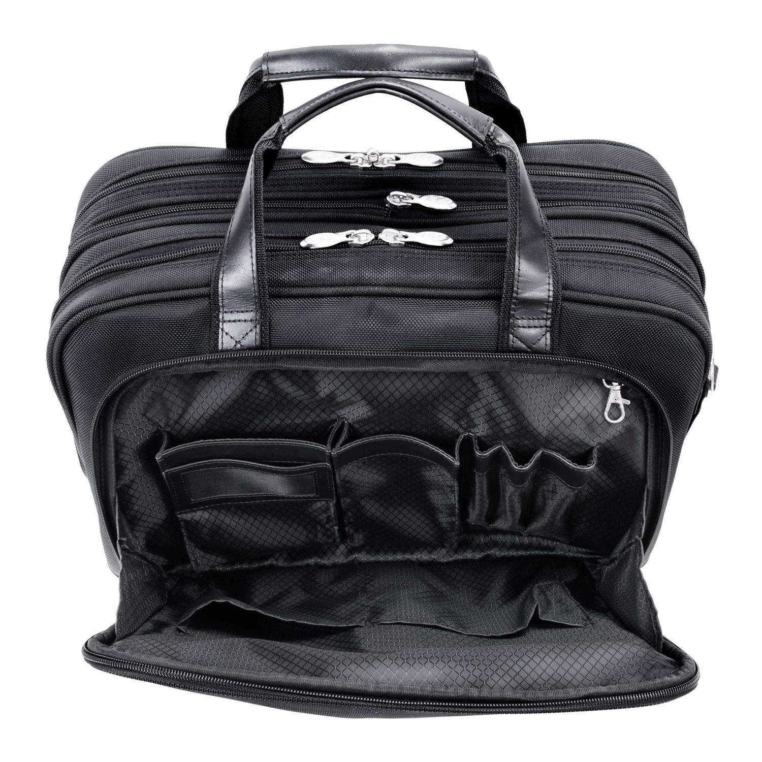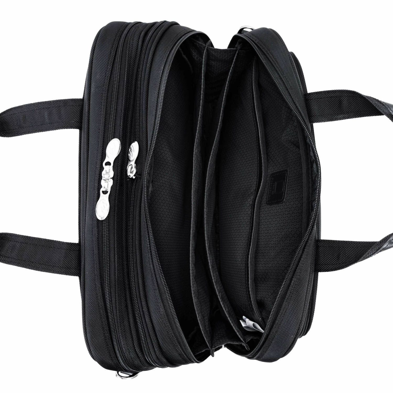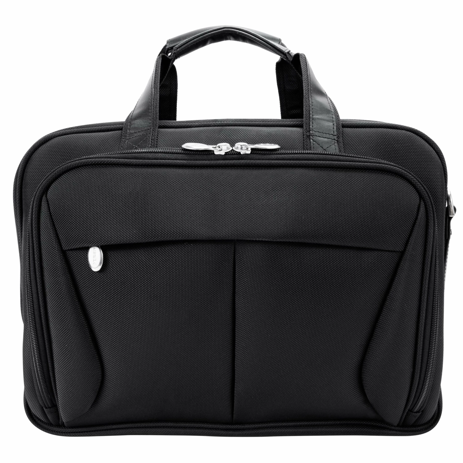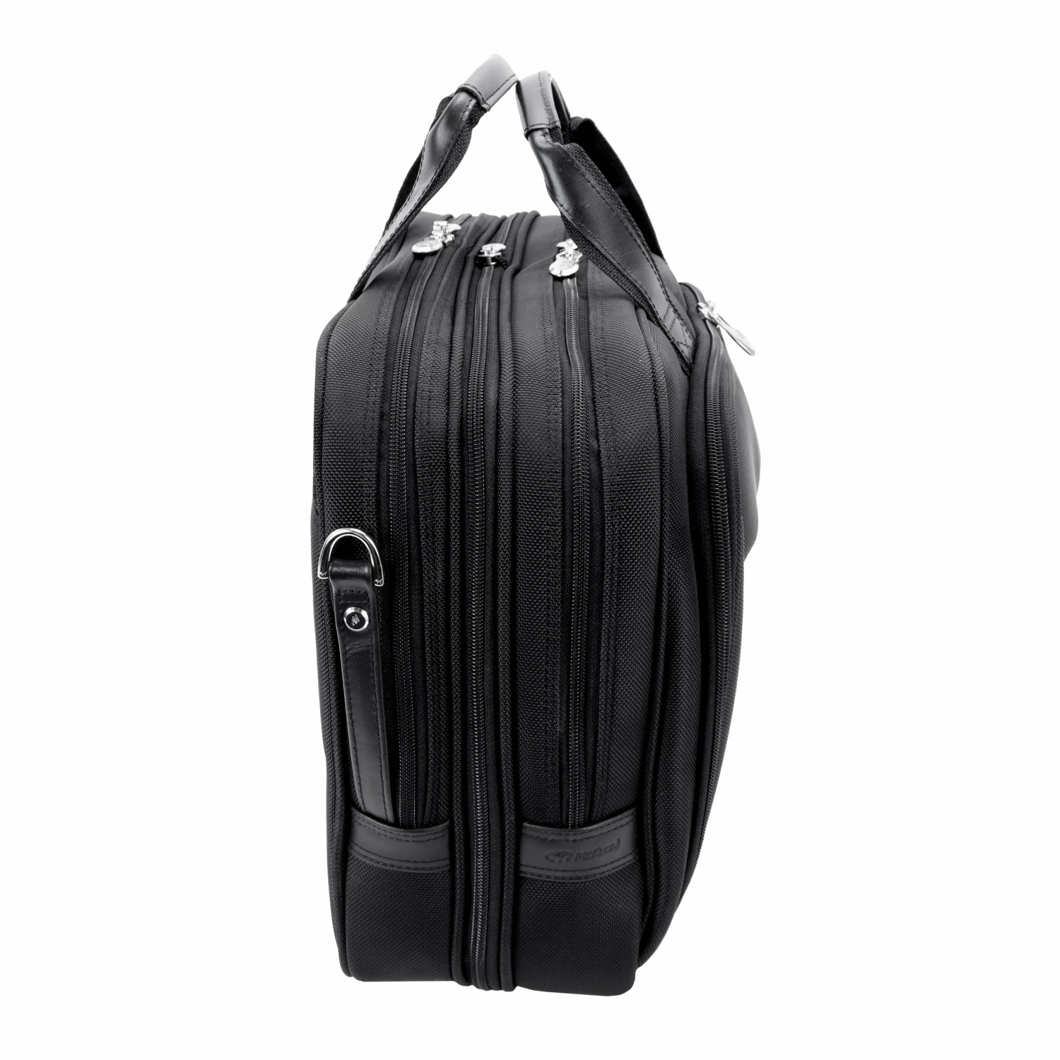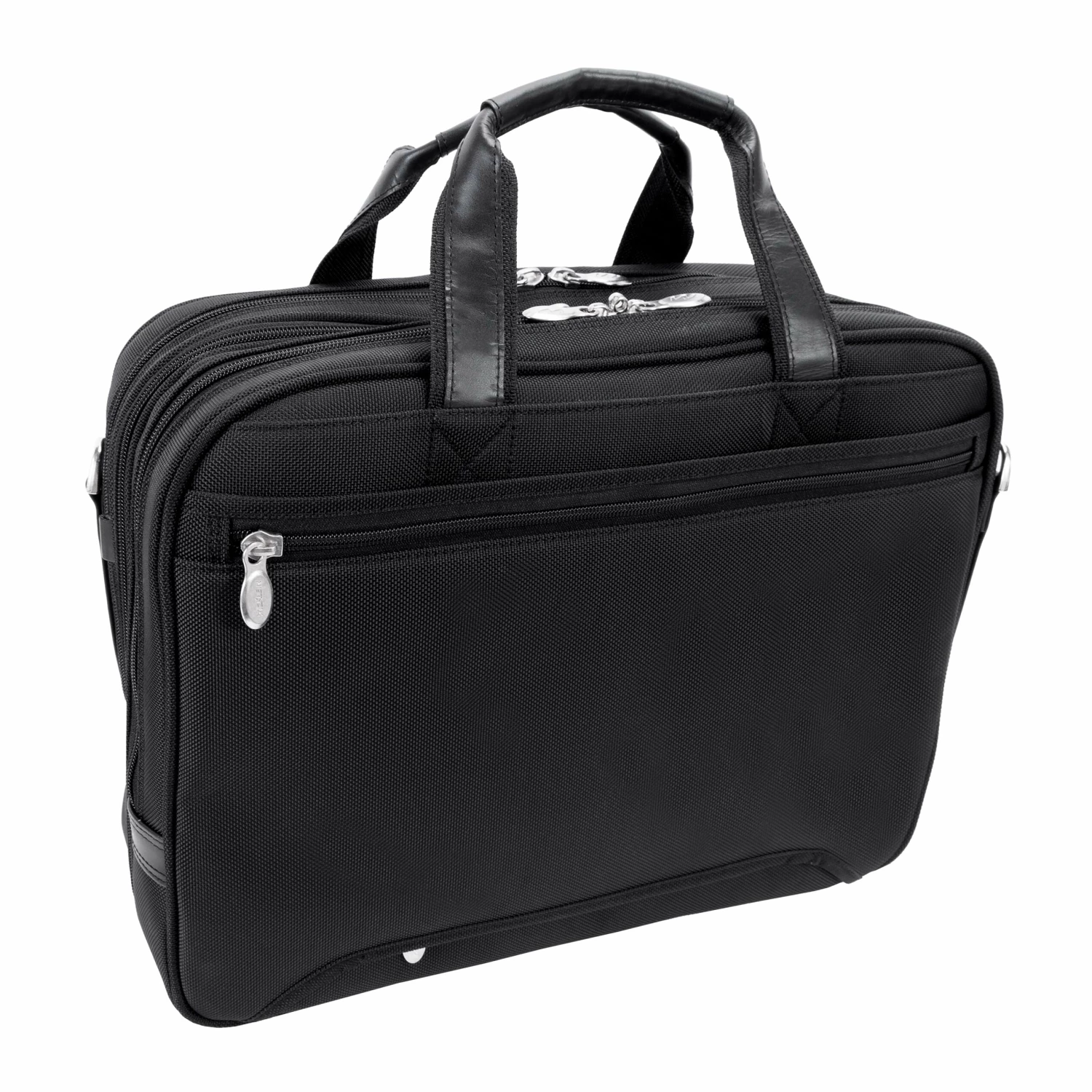 The McKlein USA Pearson Expandable Double Compartment Briefcase in Black features a front zipper pocket for small miscellaneous items. Front organizer with storage space for media devices, cell phone, business cards, key holder and pens. Front compartment features file divider for documents with an expandable feature to provide 30% more storage space. Back Compartment padded with high-density foam to protect most laptops up to 17″ size. Smart Zipper Attachment allows transport on extended handles of other rolling cases and luggage. Advanced, non-slip, shock absorbing neoprene Comfort Flex Shoulder Strap stretches for comfort, alleviating body strain.