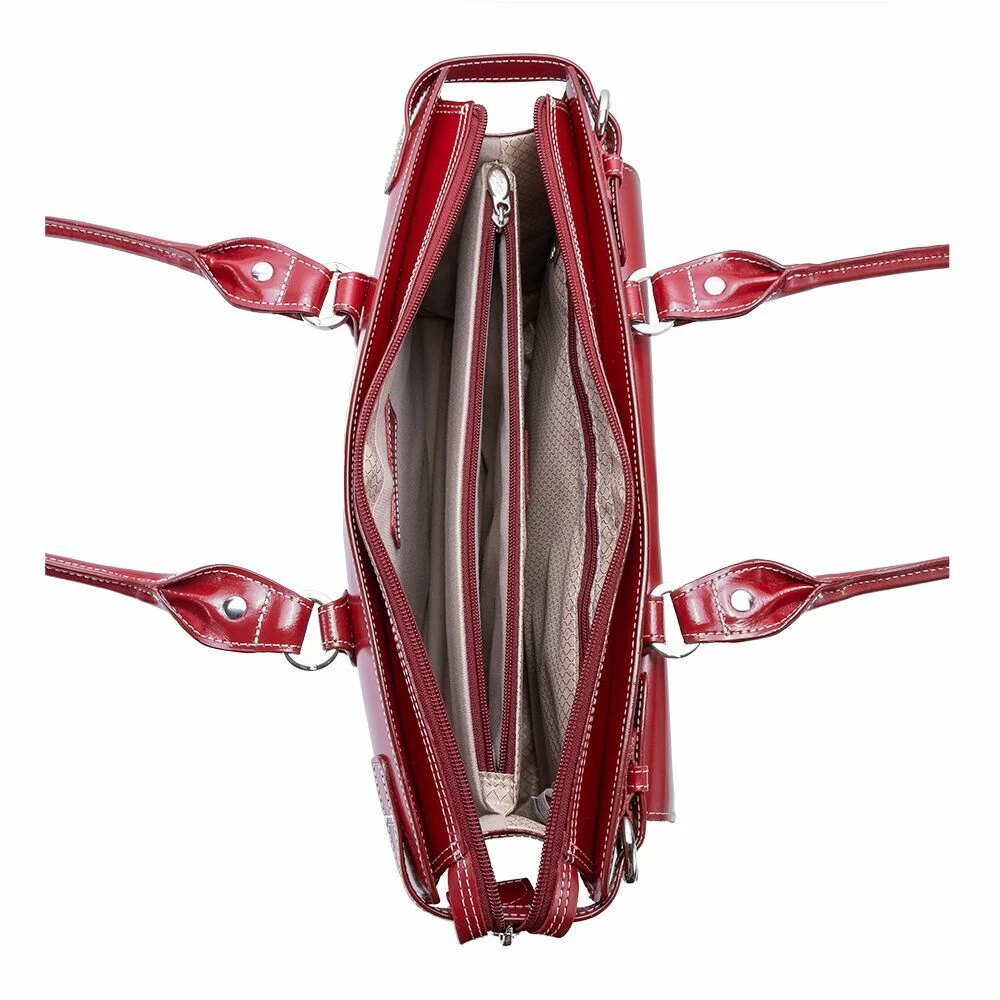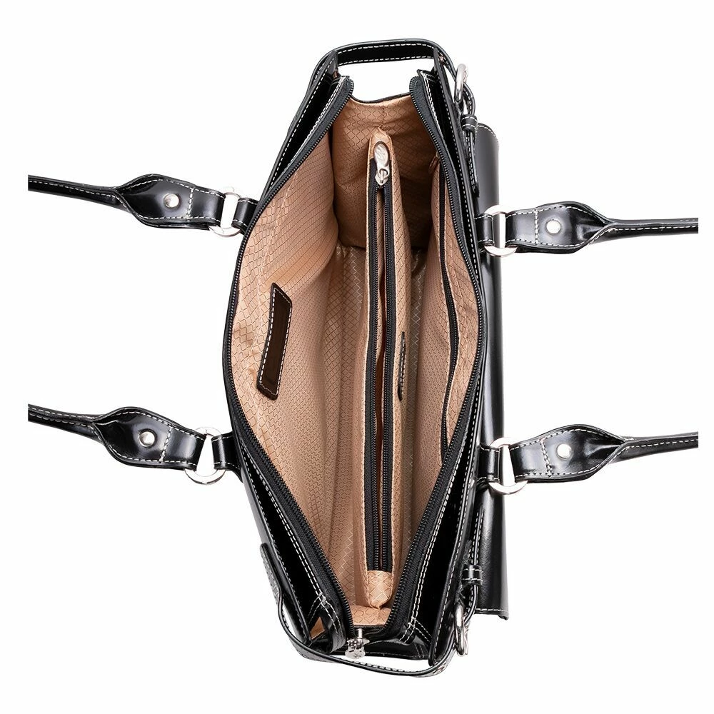 The McKlein USA Winnetka 15.4″ Leather Ladies’ Laptop Briefcase w/ Removable Sleeve has an organized top zip compartment that provides quick access to the main section with separate file divider. Front organizer section with storage space for media devices, business cards, key holder and pens. Interior zipper pocket to help organize. Double compartment divided by secured zipper pocket for important documents. Long tubular straps for carrying over your shoulder. Removable high-density laptop sleeve that protects laptops up to 15.4″ in size.