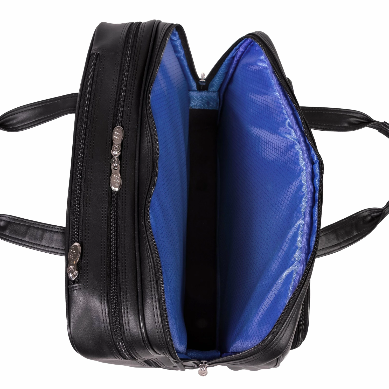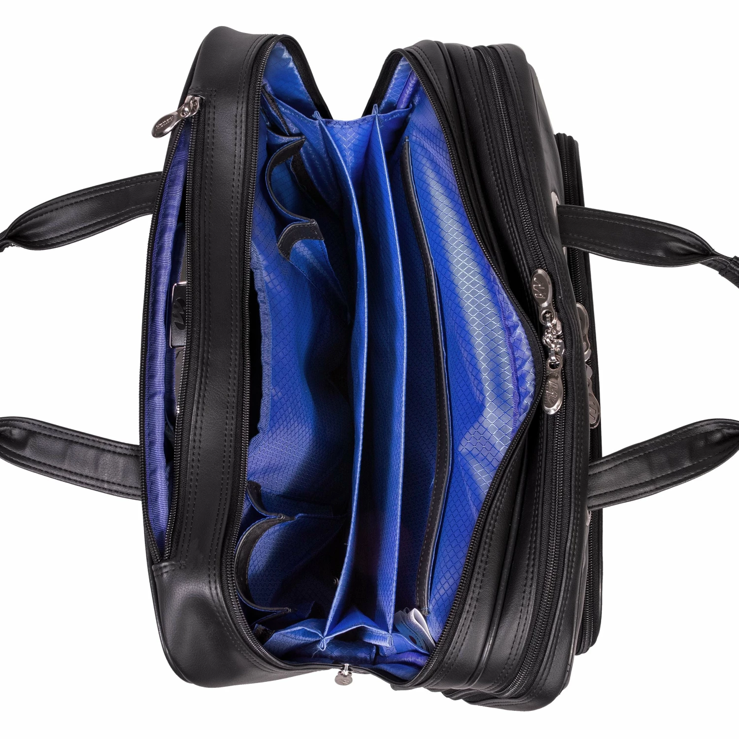 The McKlein USA Wrightwood 17″ Leather Wheeled Laptop Briefcase in Black offers front zipper pockets to store your small, miscellaneous items. Front organizer with storage space for media devices, cell phone, business cards, key holder and pens. Front compartment features file divider for documents. Built-in high-density laptop compartment that protects laptops up to 17″ in size. Dual Laptop Protection System uses a high-tech ABS frame to protect laptop from exterior impact and a built-in padded laptop sleeve with high-density foam to help absorb shock and prevent moisture intake. Smart Attachment Strap allows transport on extended handles of other rolling cases and luggage.