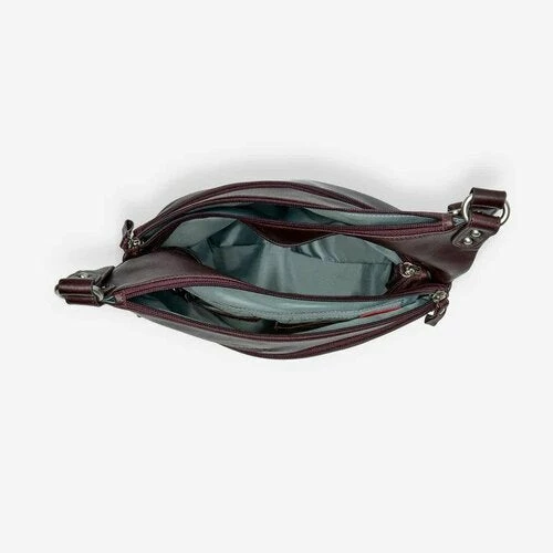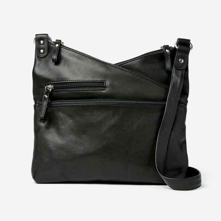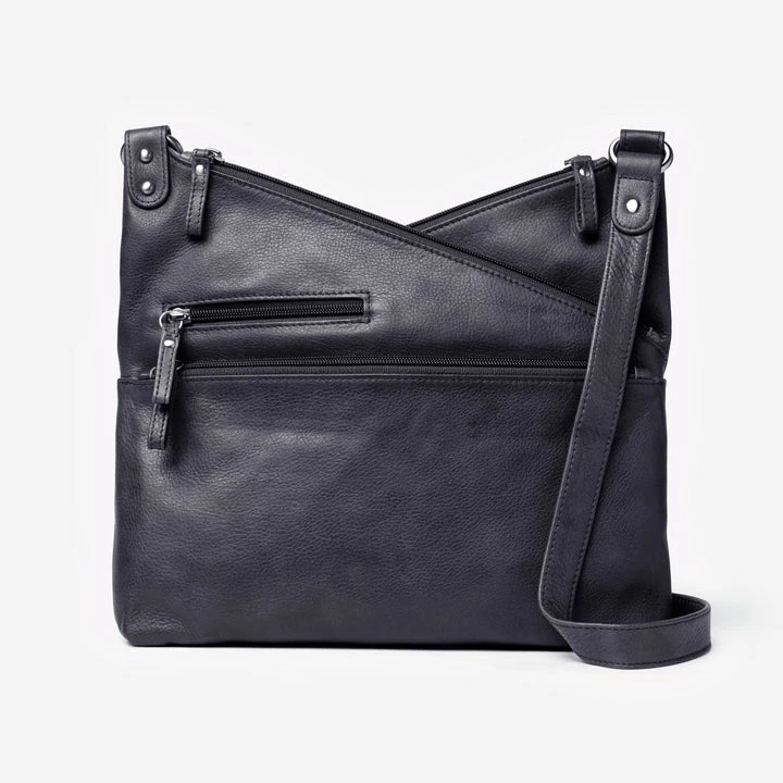 - Main zip compartment hidden between angled pockets provides secure storage