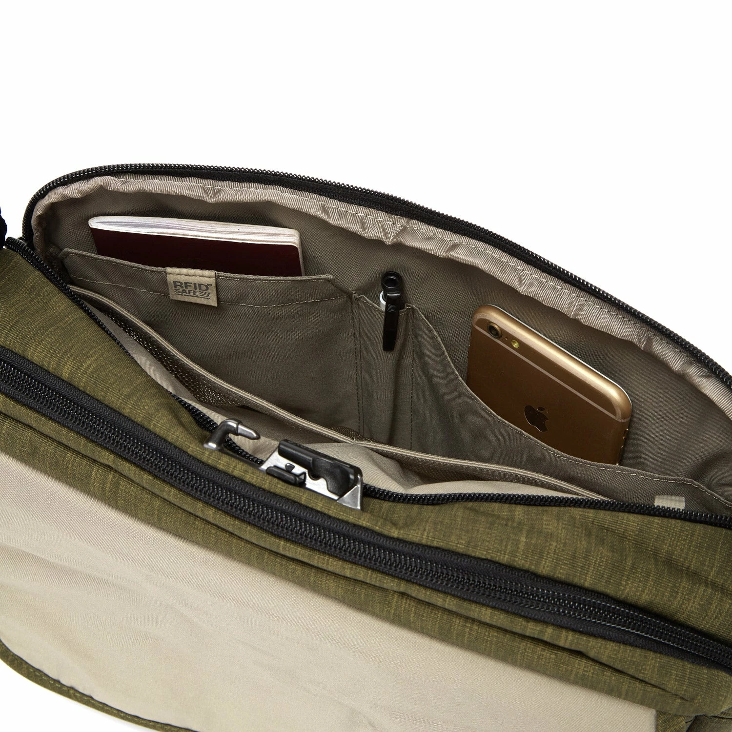 - Cut-resistant anchor strap secures around a fixed object to protect your bag