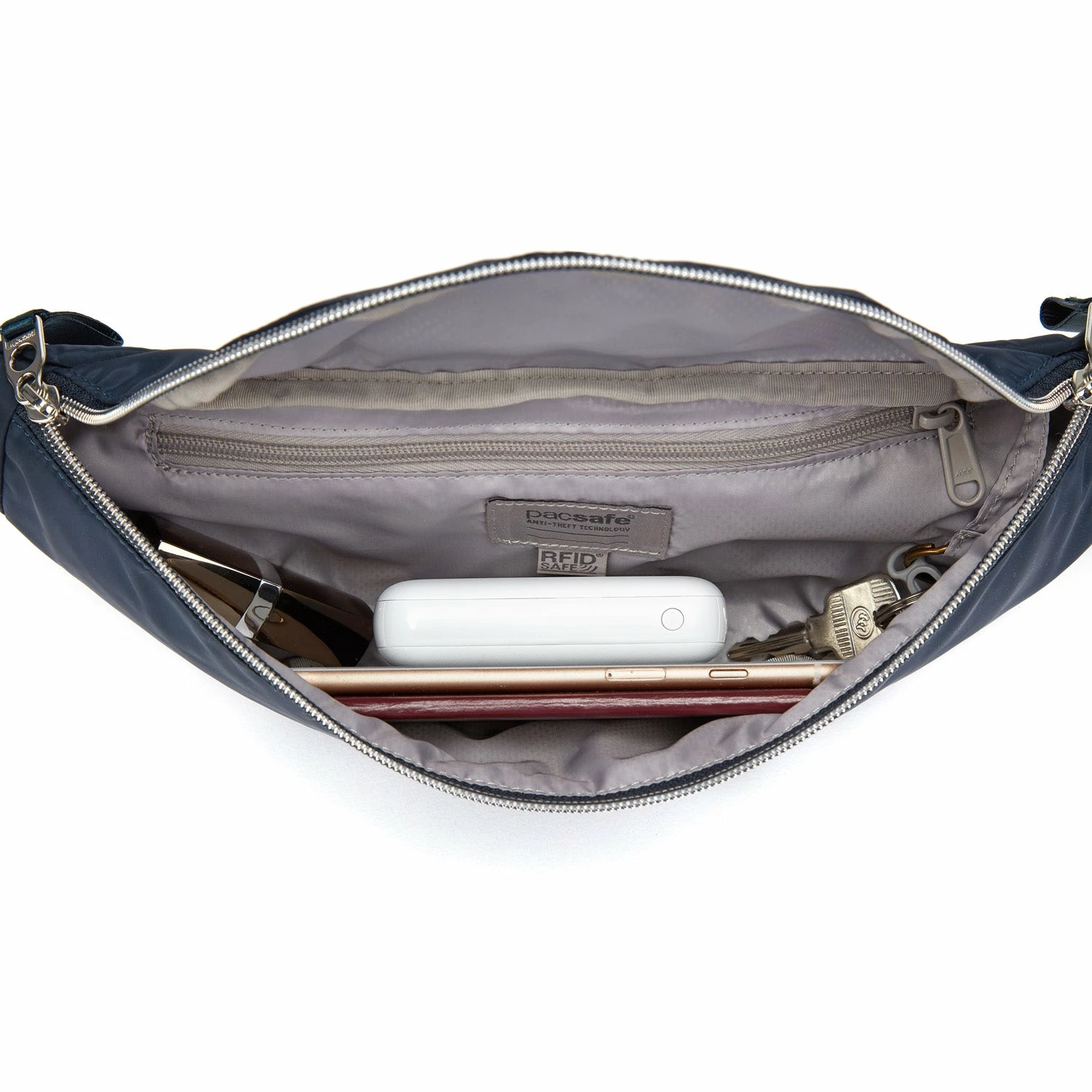 A stylish and secure sling for always-moving city life. This compact anti-theft bag can be worn safe against your front, or around your waist, fits in essentials like a passport, wallet, phone and keys and is secured by anti-theft features like RFID protection and cut-resistant materials.