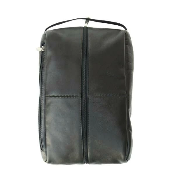 The Piel Leather Deluxe Shoe Bag features a single zip entry into a fur lined compartment with a zip-pocket divider to separate shoes and has bottom grommets for ventilation. Top handle and side zip-pocket.