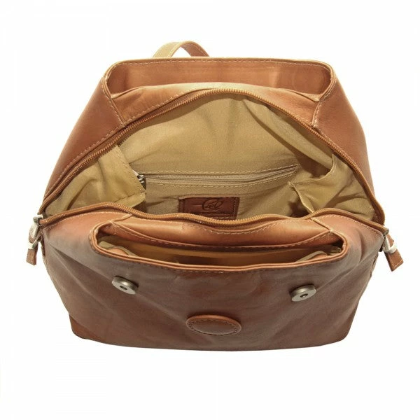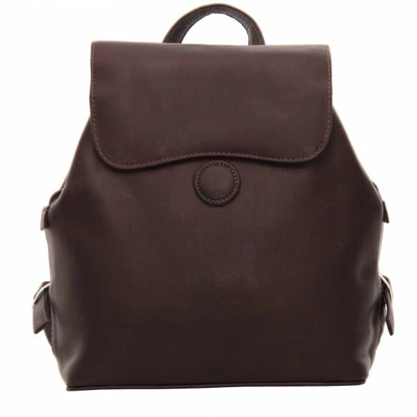 The Piel Leather Flap-Over Button Backpack has a dual magnetic snap opening into main compartment with an interior zip-pocket. Large front and back open sections with cell phone pocket. Rear zip-pocket, top handle, and adjustable backpack straps.