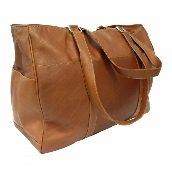 Zips opens to main compartment with interior zip-pocket and cell phone pocket. Three outside open pockets, one side open pocket, and hidden zip pocket on top. Long double shoulder straps.