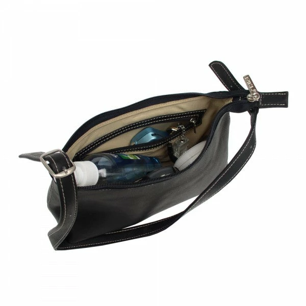 The Piel Leather Mini Shoulder Bag features a top zip opening into the lined main compartment with inside zip pocket and cell phone pocket. Adjustable 24″ shoulder strap.