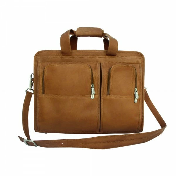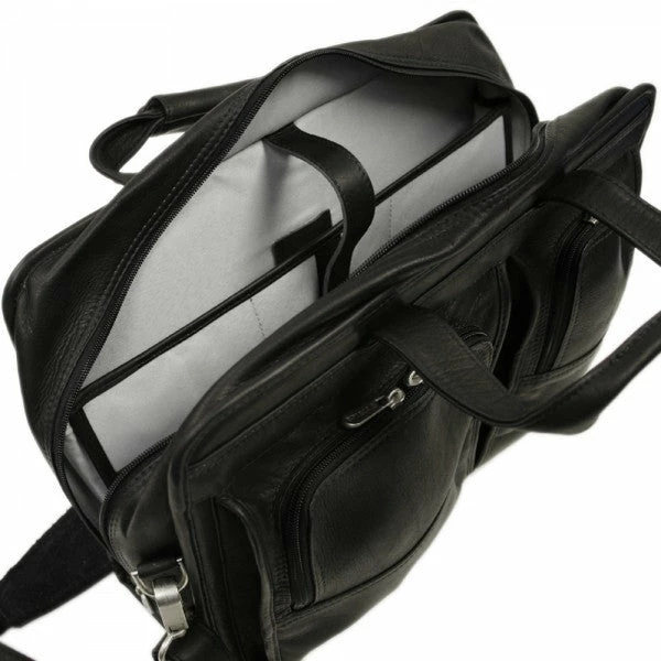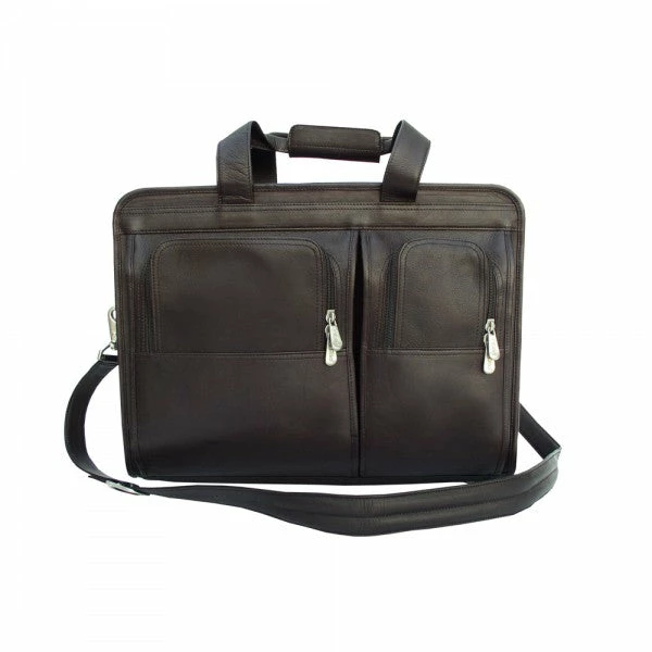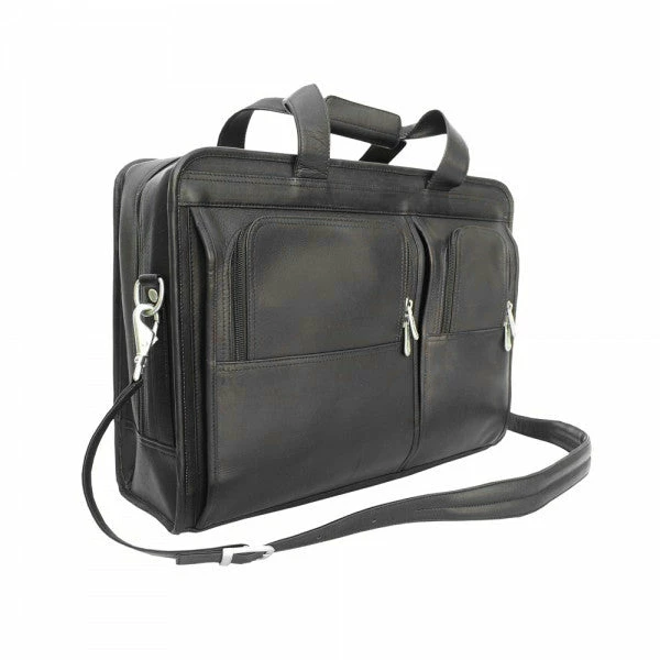 The Piel Leather Professional Computer Portfolio features a zip opening into the main compartment which offers a padded 16″ laptop pocket, large file pocket, multiple open pockets, and full organizer. Two front half moon pockets with cell phone holder. Spacious rear zip-pocket, double handles for easy carrying and an adjustable/detachable shoulder strap.