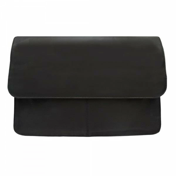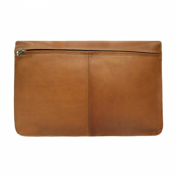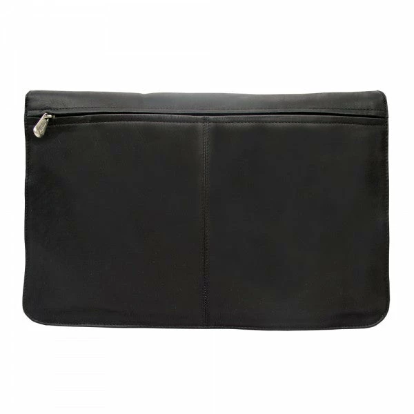 Flap-over with double magnetic closure opens to reveal large zip-pocket and main compartment with large zip divider, interior zip-pocket, pen slots, and small open pocket. Large rear zip-pocket.