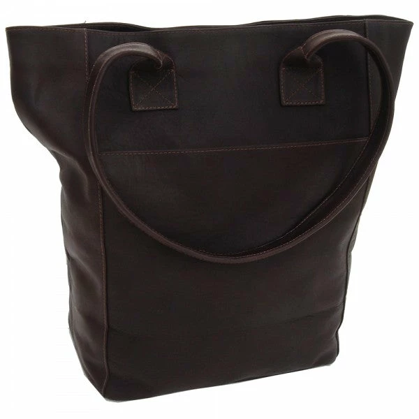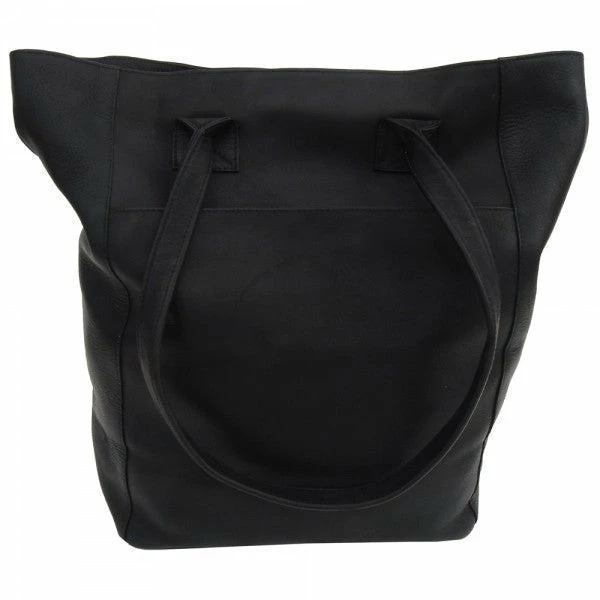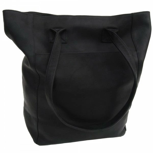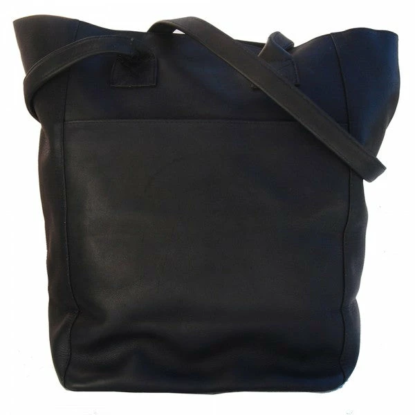 Magnetic snap closure to main compartment with interior zip-pocket. Large front open pocket, two rear open pockets, and long double shoulder straps.