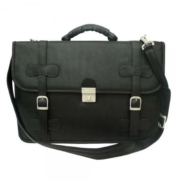 The Piel XXL Flapover Portfolio features a flap opening with two magnetic buckles and combination lock closure. Inside reveals a compartment padded for a laptop, middle zip-compartment, and third compartment with full organizer. Large zip-pocket on the back, top handle for easy carrying and an adjustable/detachable shoulder strap.