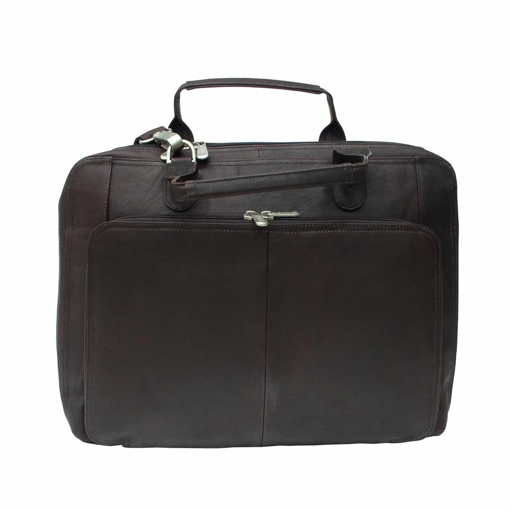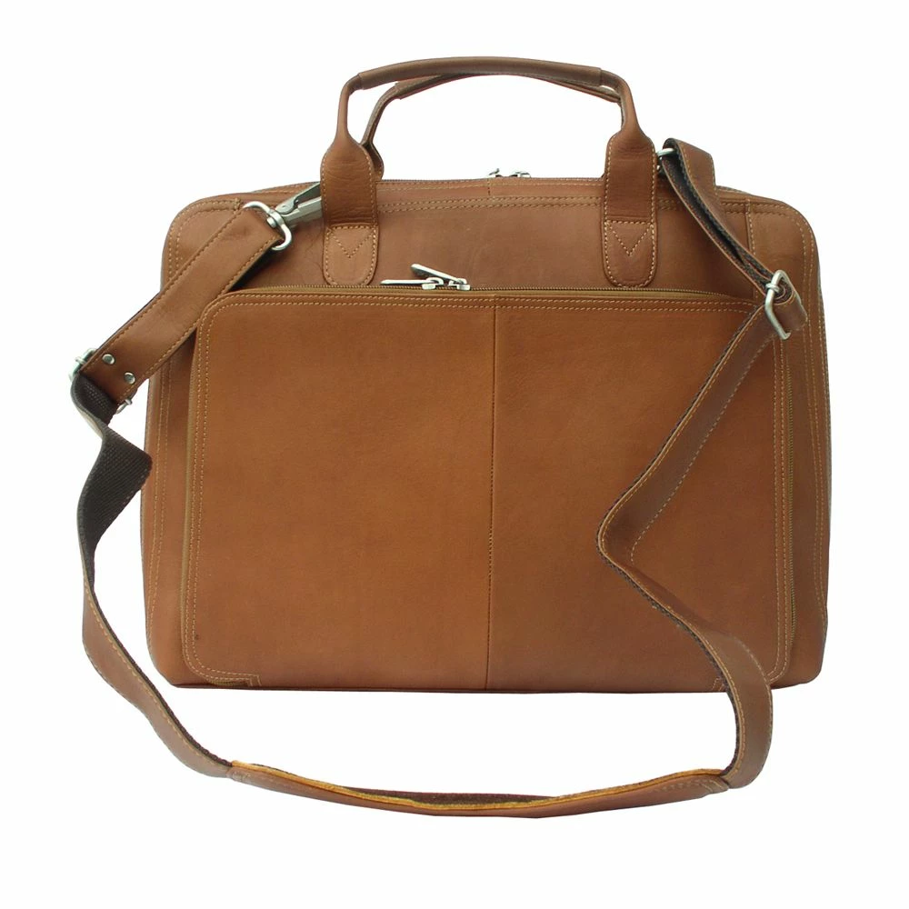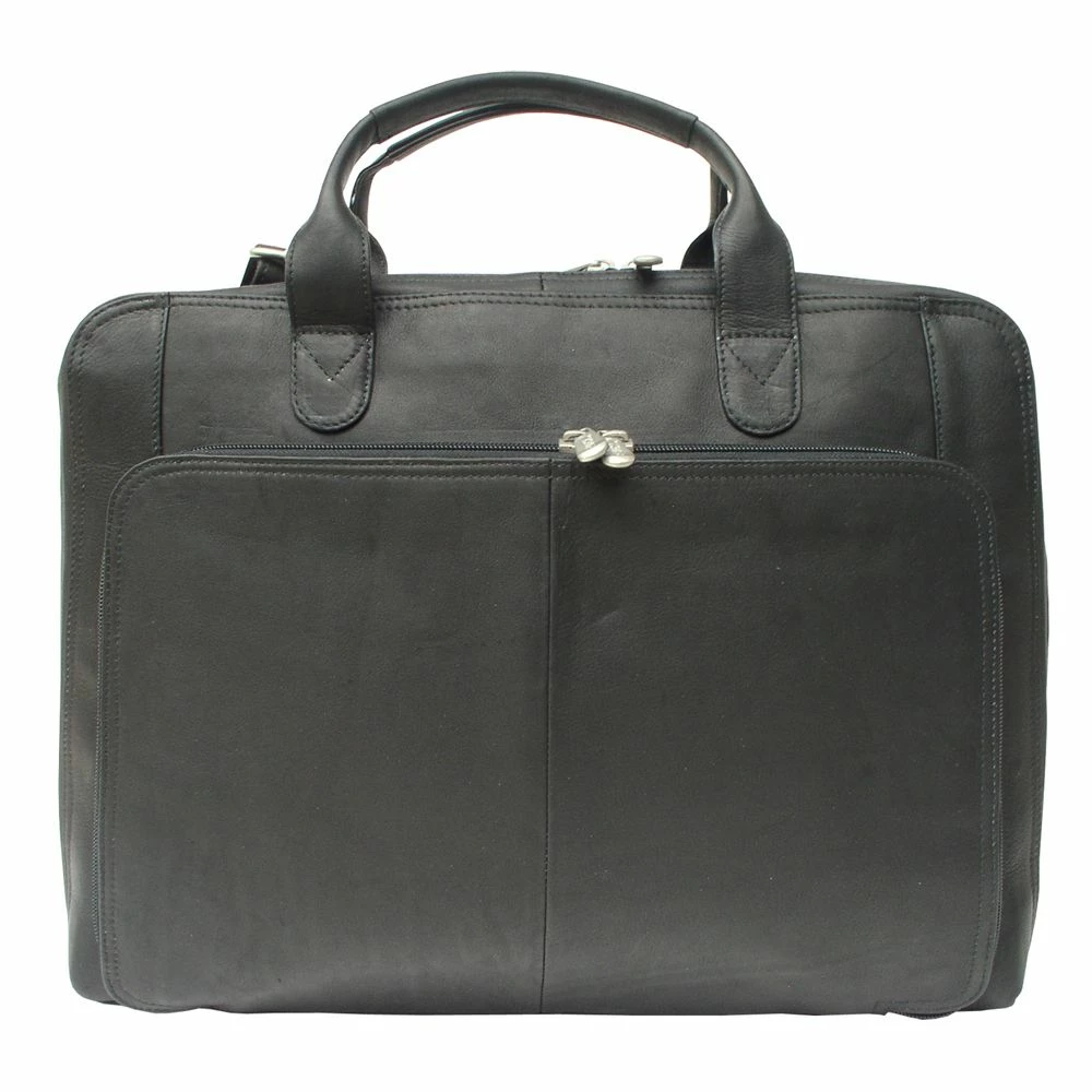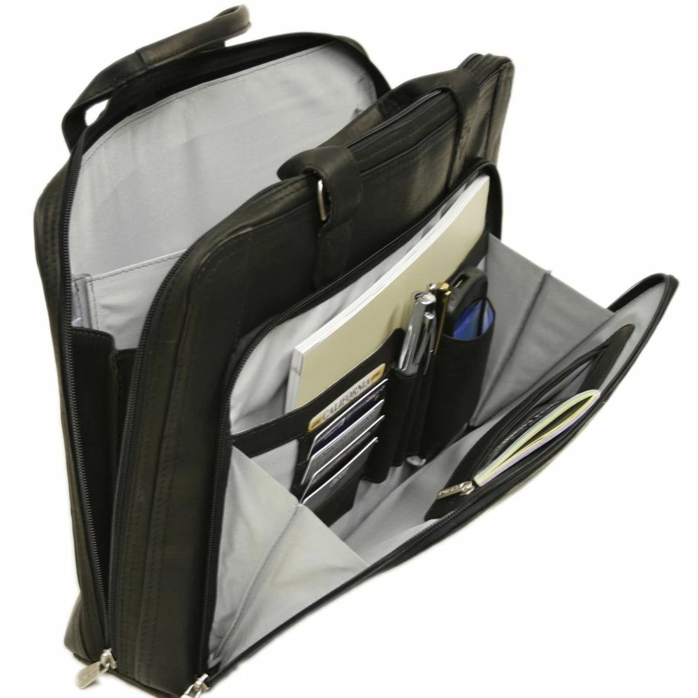 Top zippered opening to main compartment with a padded laptop pocket (15.5″ x 12″ x 2″), two small open pockets, and one large open pocket for files. Front gusseted zip-pocket with full organizer, open pocket, and interior zip-pocket. Rear open pocket, double handles, and an adjustable/detachable shoulder strap.