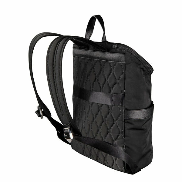 Designed for everyday use as well as business and short travels, this fashion forward carry-on backpack is guaranteed to be a head-turner. Modern and versatile, it offers luxe “Midnight Twill” water-resistant microfiber, a spacious interior—including padded pouches for a laptop and tablet—hide-away carry handles and back straps, plus a handle pass-through sleeve (with a zip- closed bottom that creates an extra pocket) for transporting on top of a suitcase.
