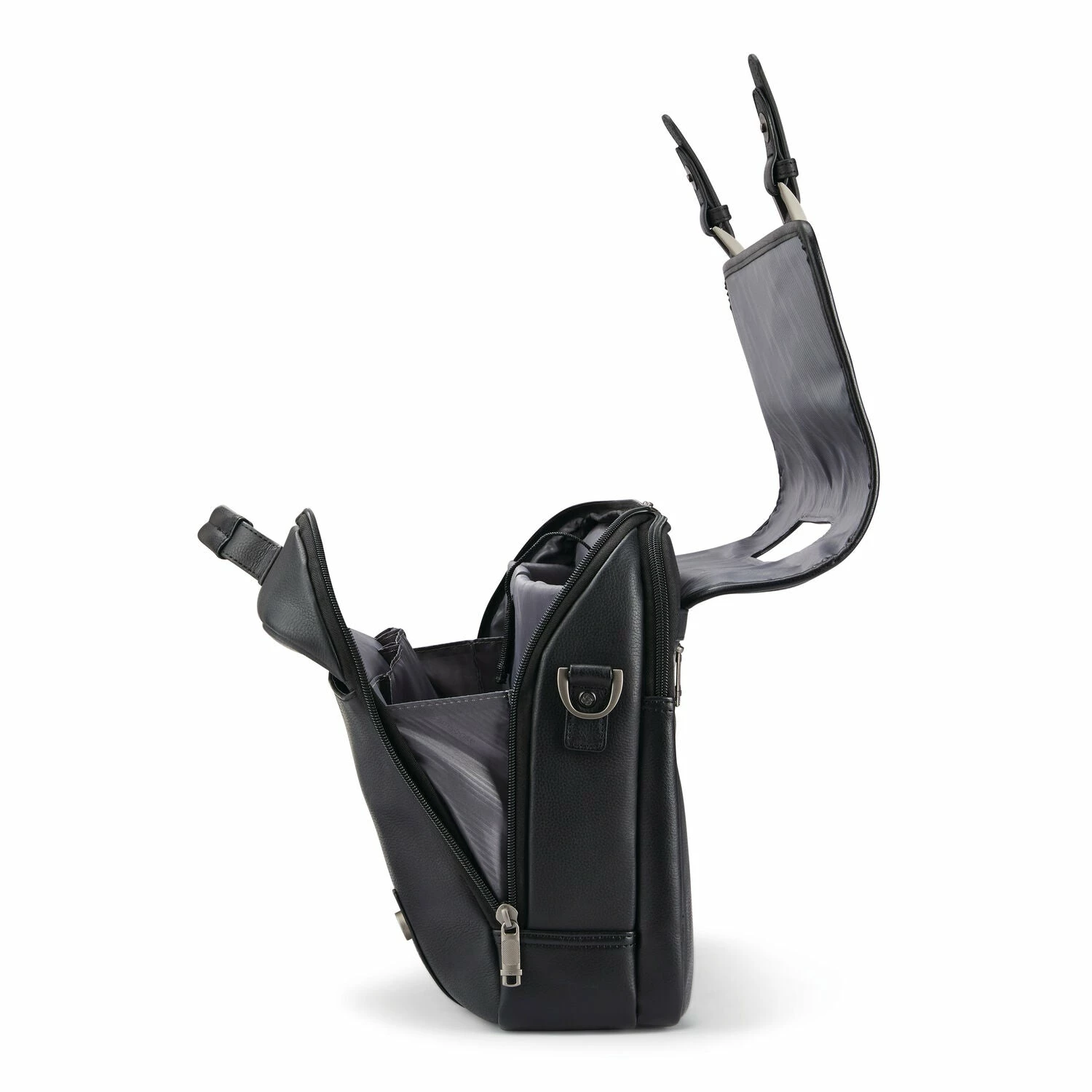 - Classic double buckle business satchel; fits up to 2 laptops up to 15.6″