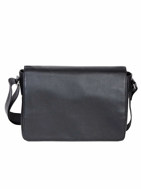 The Scully Leather Soft Plonge Messenger Brief in Black features a single gusset with a zip pocket in the back and open pockets in the front. An outer zip pocket pocket on the back holds accessories or frequently need items.