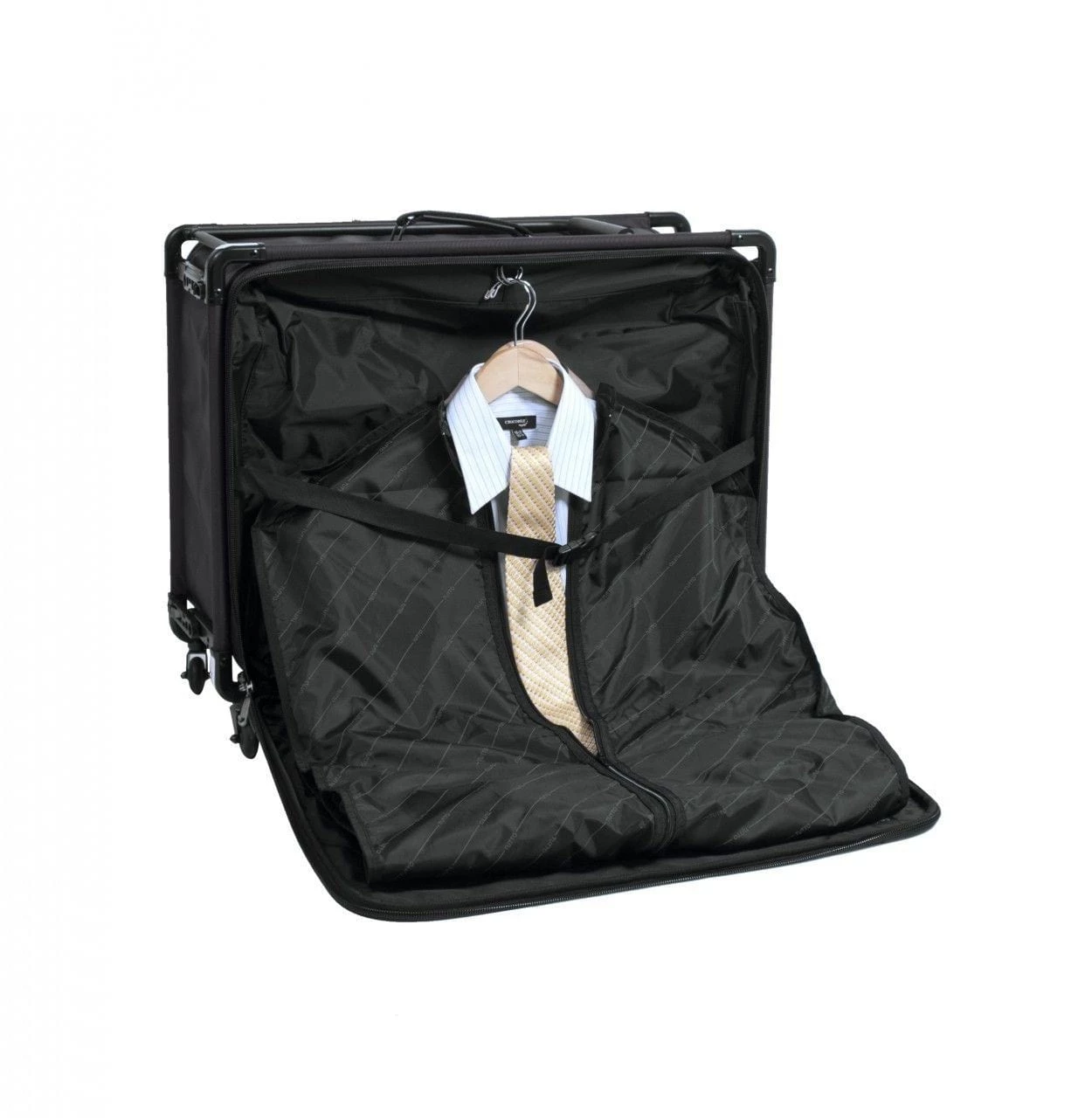 The garment compartment has a fold-out panel and a removable garment bag to help keep your clothes wrinkle-free.