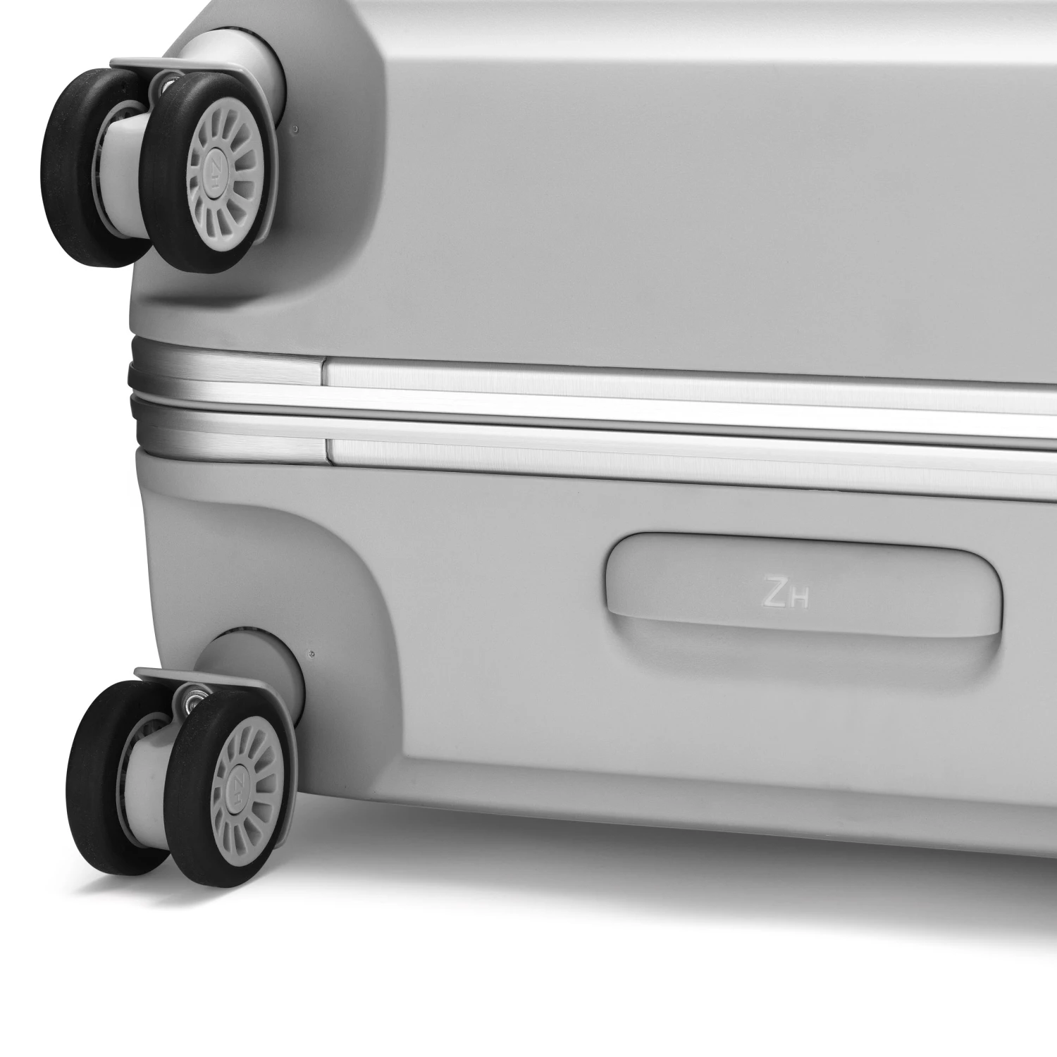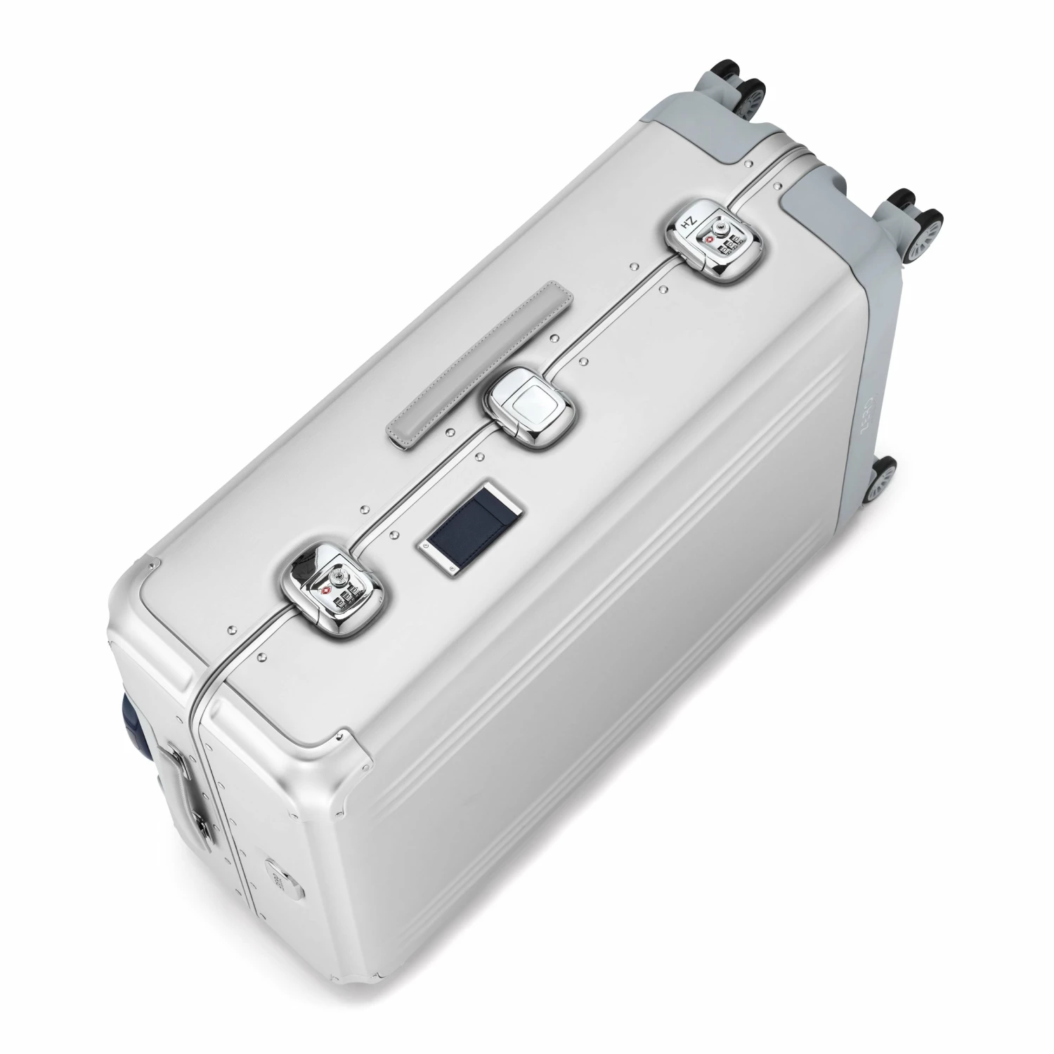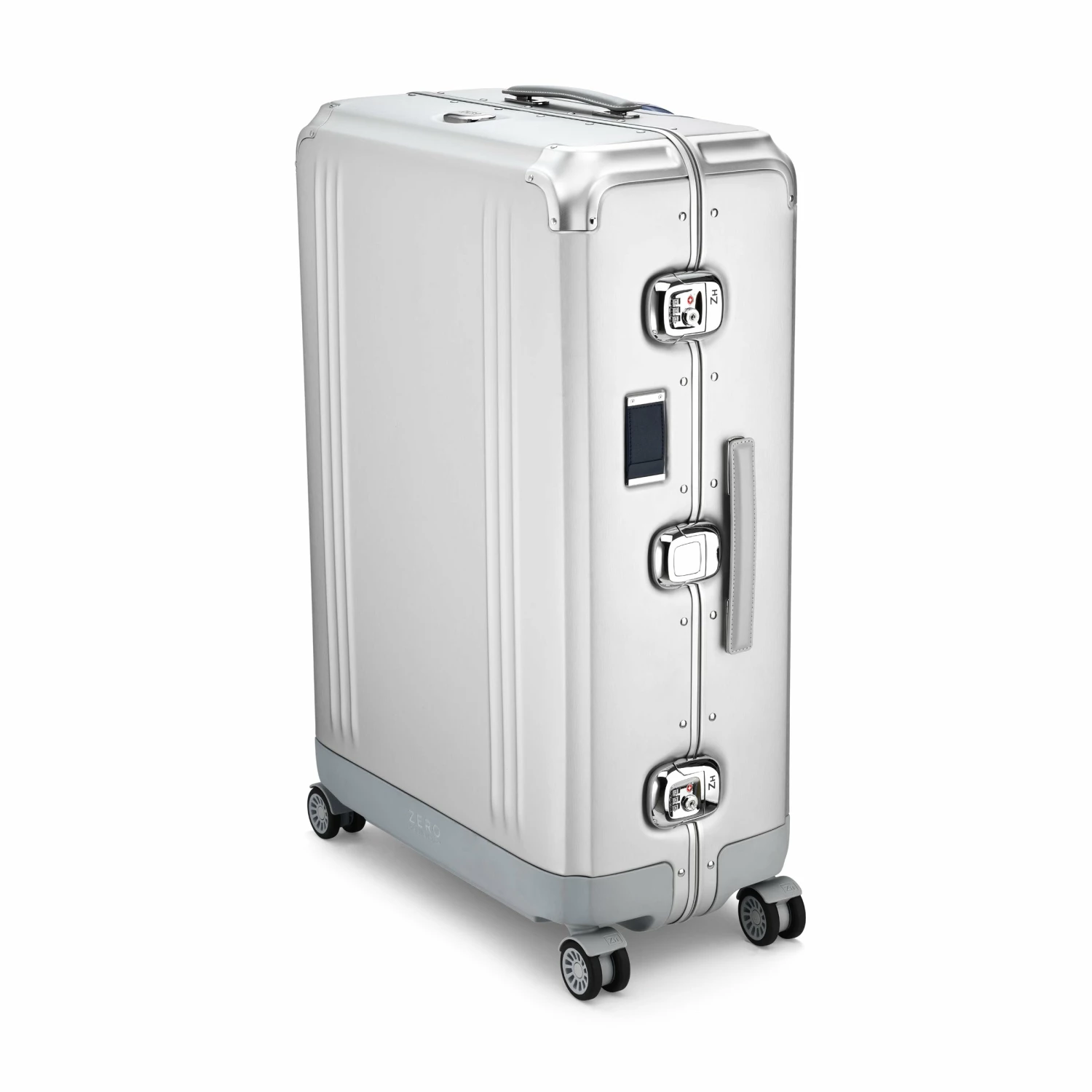 - Silver brushed aluminum with light gray coated leather handles, ZH Blue interior with ZH monogram and brilliant ZH blue pull handle